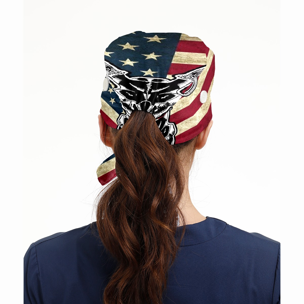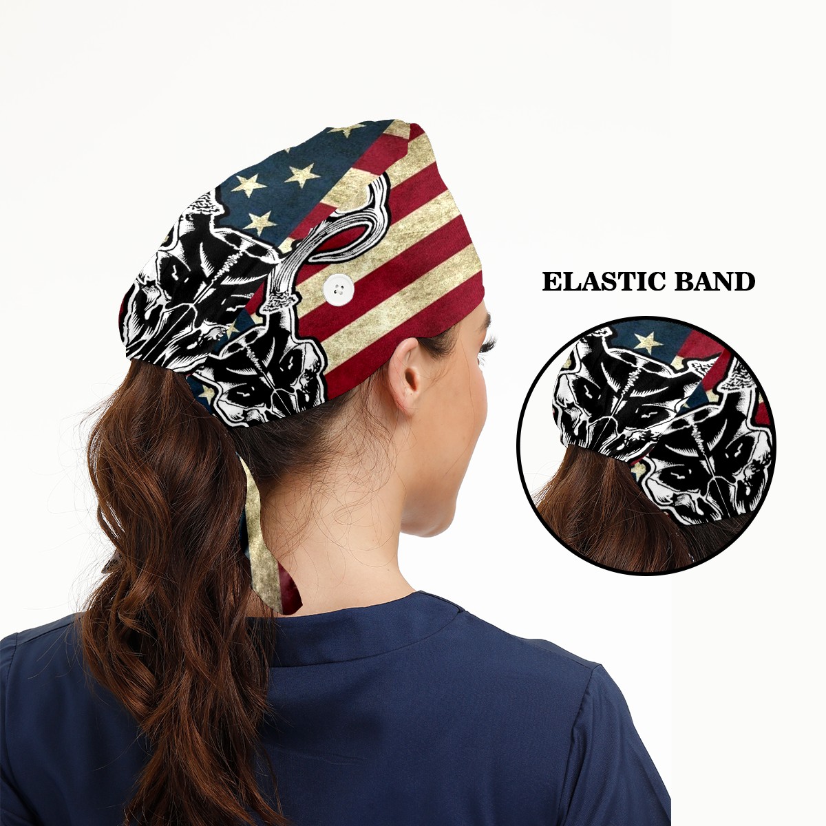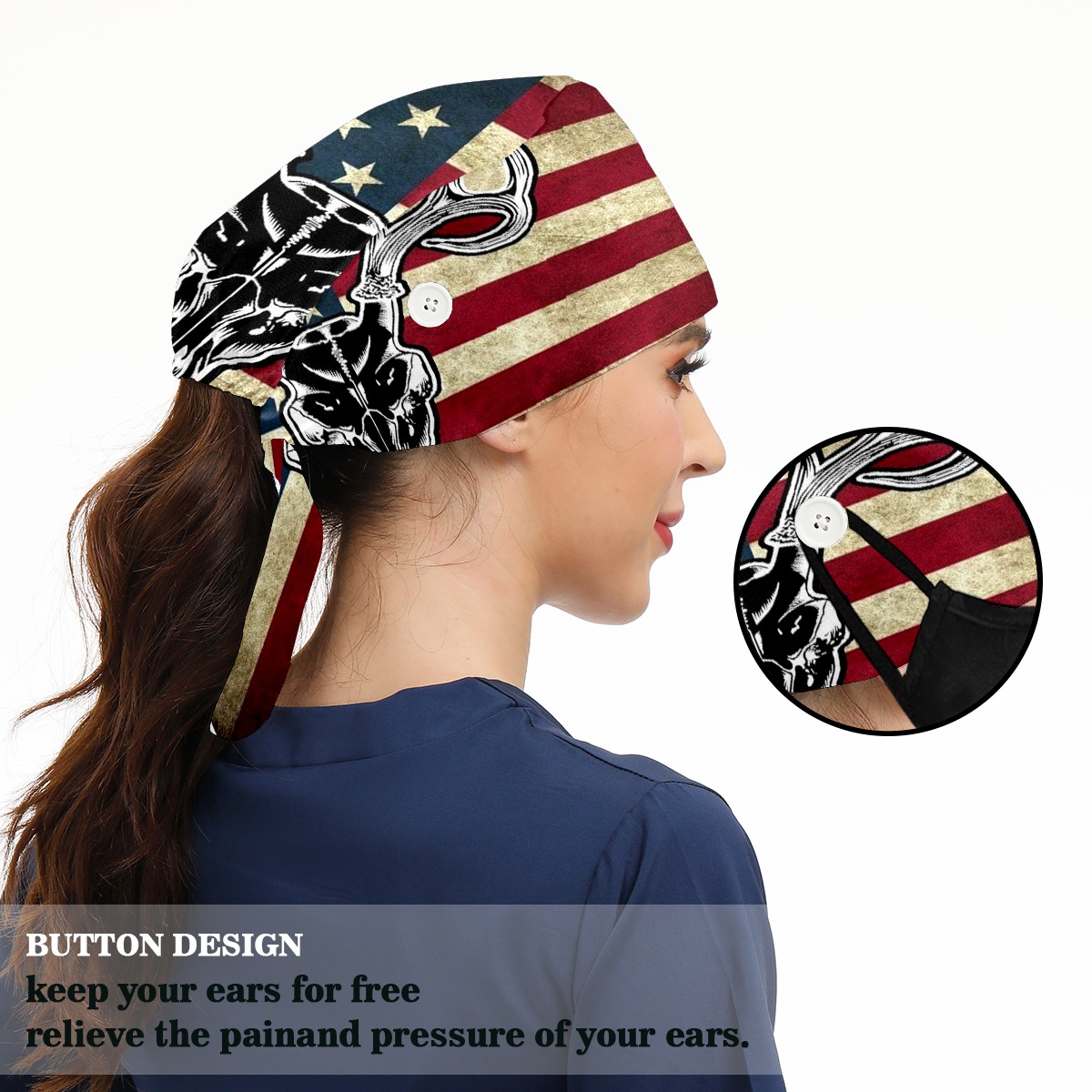 Working Caps with Button & Sweatband Satin Lined Cotton Adjustable Nurse Hats Elastic Band Scrub Cap Surgeon Hat Deer Hunter Skull Flag
