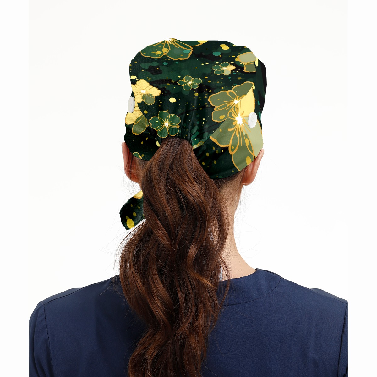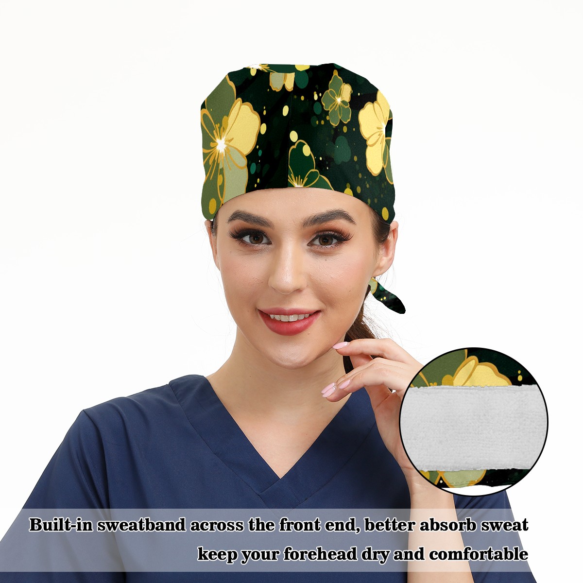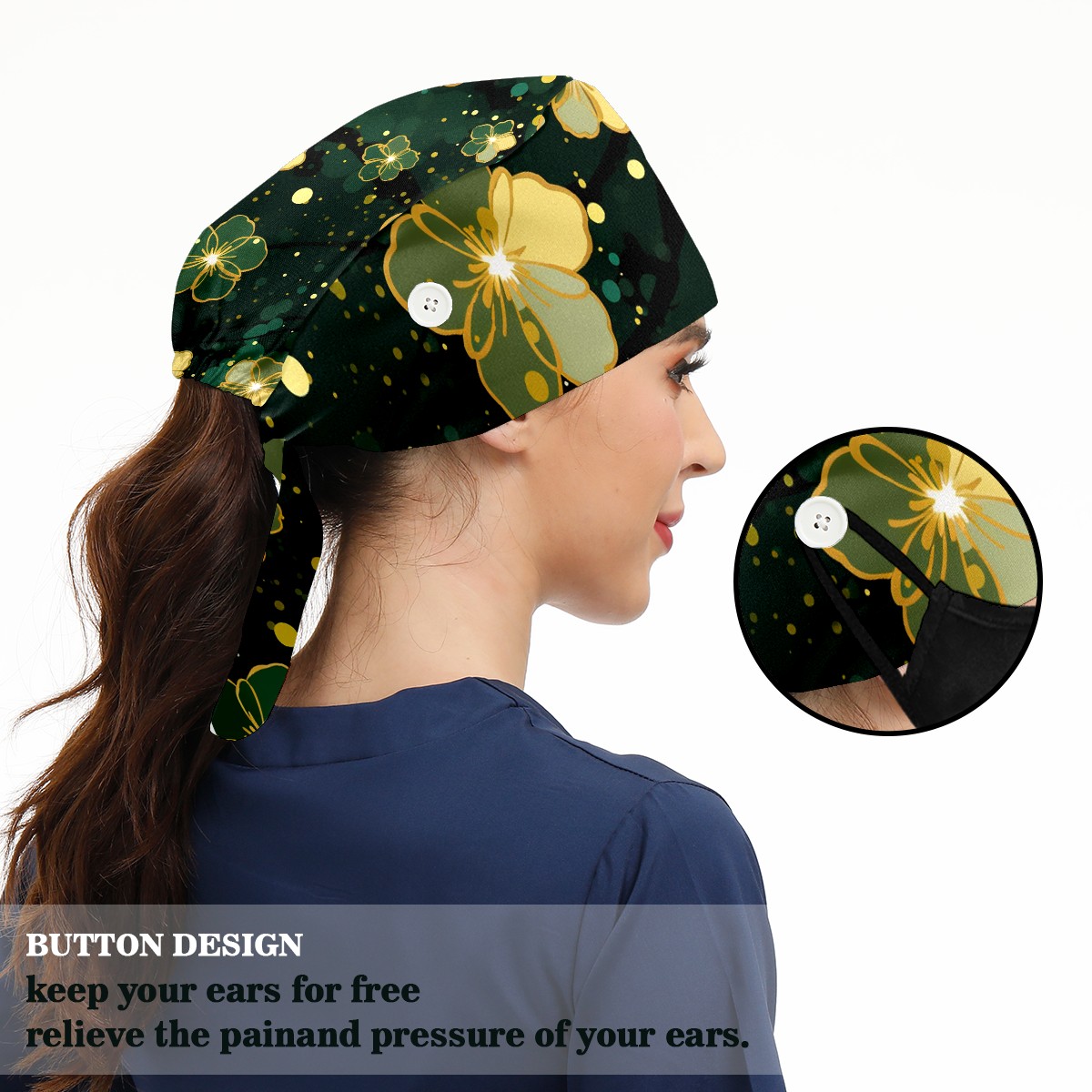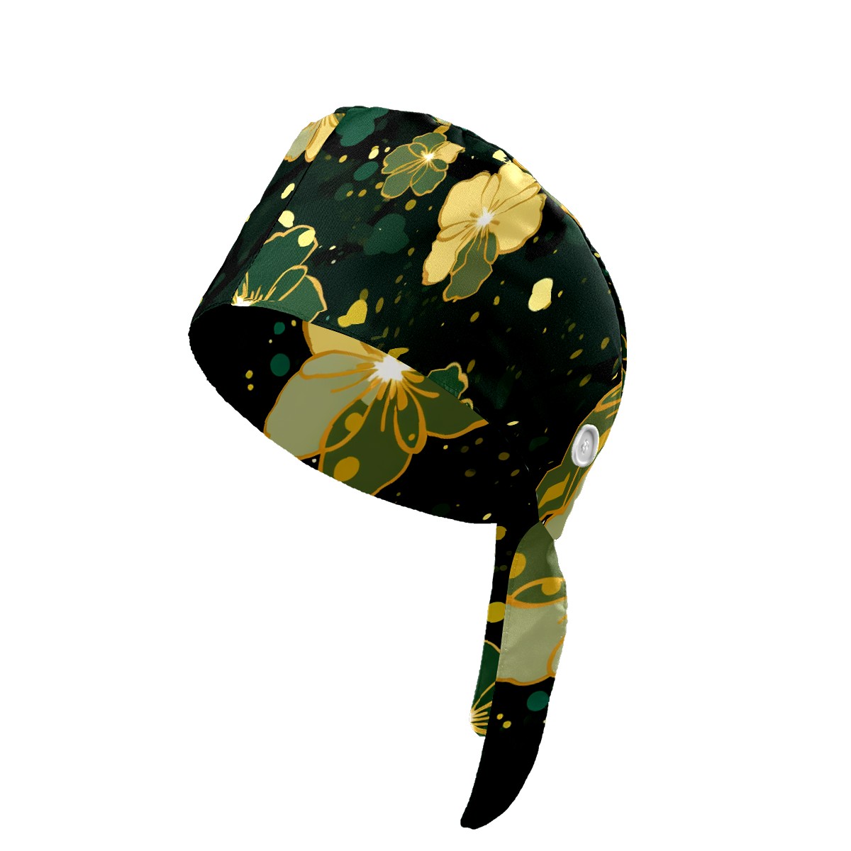 Working Caps with Button & Sweatband Satin Lined Cotton Adjustable Nurse Hats Elastic Band Scrub Cap Surgeon Hat Gold Flowers (6)