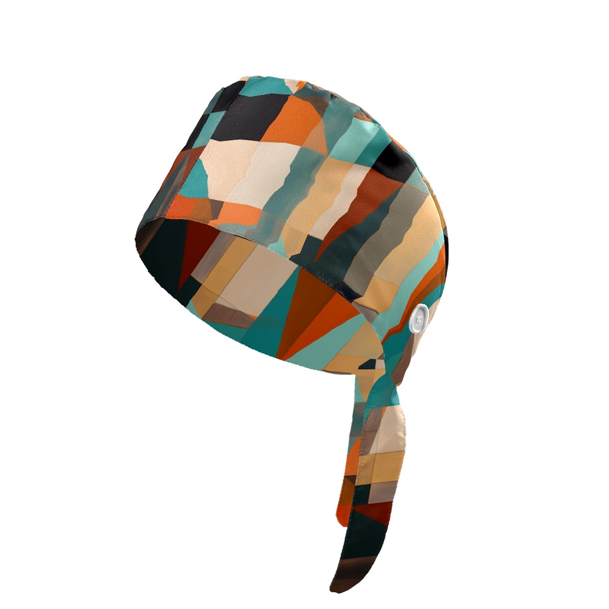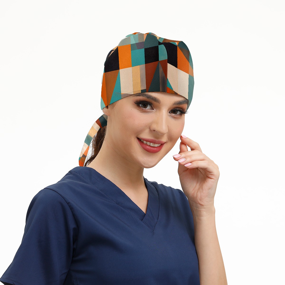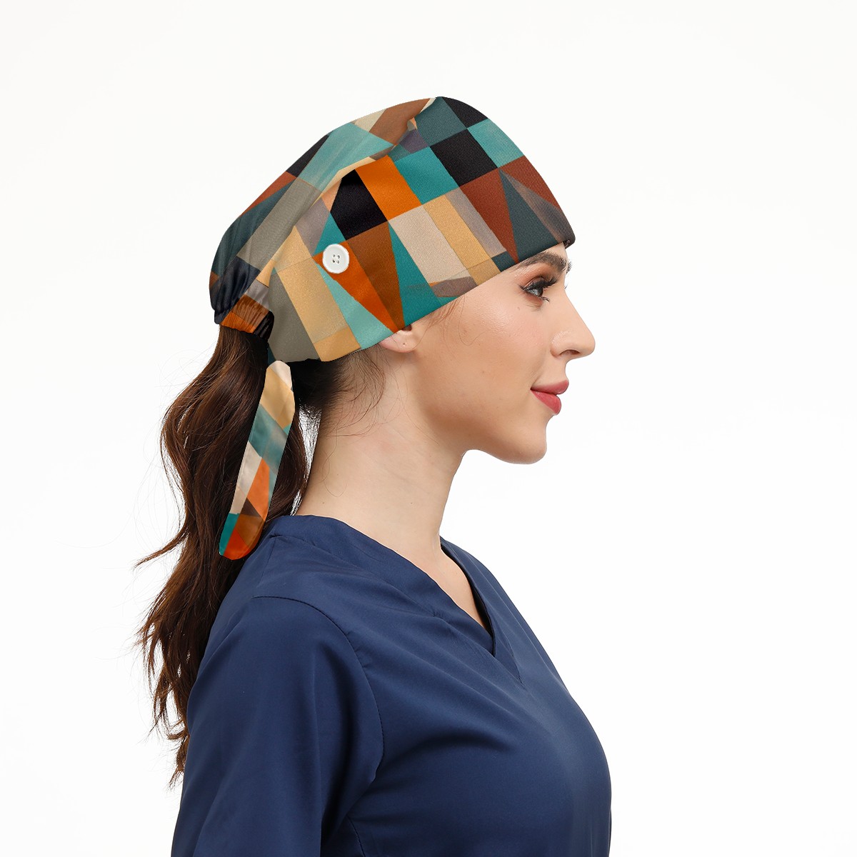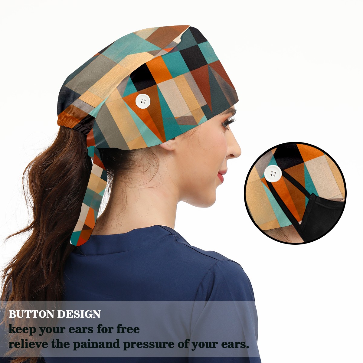 Working Caps with Button & Sweatband Satin Lined Cotton Adjustable Nurse Hats Elastic Band Scrub Cap Surgeon Hat Colorful Geometric