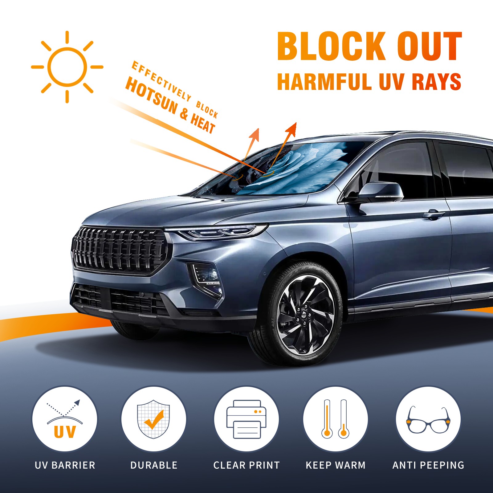 </b>ZXIVGOQFR Foldable Premium Car Windshield Sunshade is your great solution to reduce your car’s interior temperature dramatically! This is definitely a must-have item for your summer travel! </b> <br> </b>Size: 63"L x 33.5"W </b> <br> </b>Blocking Uv Rays & Heat Insulation</b><br> Our vehicle sunshade provides effective UV, sun, and summer heat protection .Maintains dashboards by preventing fading and cracking <br> </b>Easy-To-Store Folding Design Makes Storage Convenient </b><br> ZXIVGOQFR car sunshades come with removable suction cups and elastic bands that you can install easily and quickly, and the removable suction cups will not leave any marks on your windows when removed. Within seconds, windshield visor can be installed and removed. When not in use,the front windshield can be easily and effectively placed on the door pocket or the dashboard, which is beautiful and does not take up space in the car.<br> <br> </b>PUT UP A 'PROTECTIVE UMBRELLA' FOR YOUR BELOVED CAR!</b>