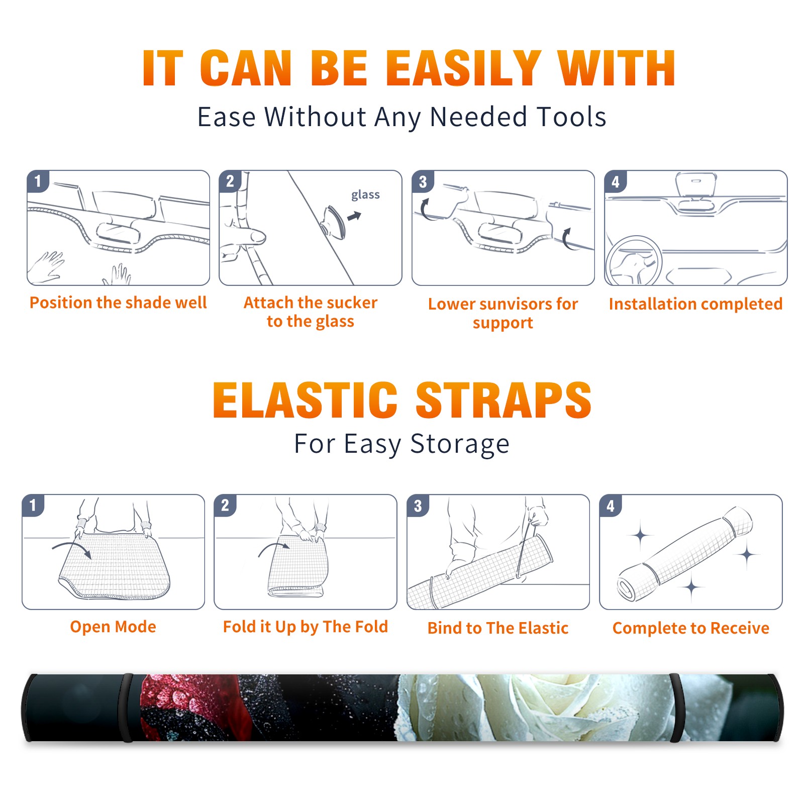 • </b>ZXIVGOQFR Foldable Premium Car Windshield Sunshade is your great solution to reduce your car’s interior temperature dramatically! This is definitely a must-have item for your summer travel! </b> <br> </b>Size: 63"L x 33.5"W </b> <br> </b>Blocking Uv Rays & Heat Insulation</b><br> Our vehicle sunshade provides effective UV, sun, and summer heat protection .Maintains dashboards by preventing fading and cracking <br> </b>Easy-To-Store Folding Design Makes Storage Convenient </b><br> ZXIVGOQFR car sunshades come with removable suction cups and elastic bands that you can install easily and quickly, and the removable suction cups will not leave any marks on your windows when removed. Within seconds, windshield visor can be installed and removed. When not in use,the front windshield can be easily and effectively placed on the door pocket or the dashboard, which is beautiful and does not take up space in the car.<br> <br> </b>PUT UP A 'PROTECTIVE UMBRELLA' FOR YOUR BELOVED CAR!</b>