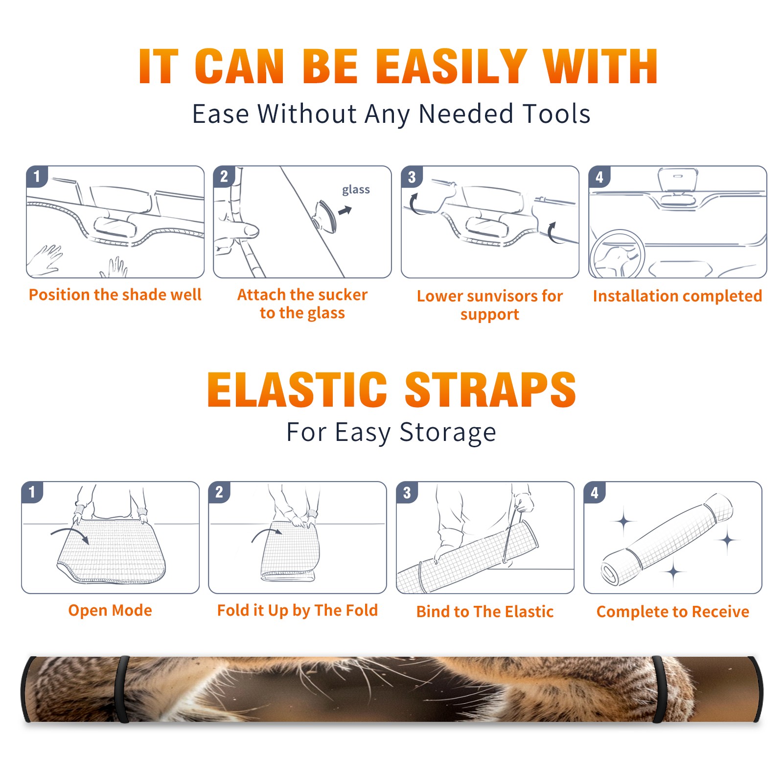 </b>ZXIVGOQFR Foldable Premium Car Windshield Sunshade is your great solution to reduce your car’s interior temperature dramatically! This is definitely a must-have item for your summer travel! </b> <br> </b>Size: 63"L x 33.5"W </b> <br> </b>Blocking Uv Rays & Heat Insulation</b><br> Our vehicle sunshade provides effective UV, sun, and summer heat protection .Maintains dashboards by preventing fading and cracking <br> </b>Easy-To-Store Folding Design Makes Storage Convenient </b><br> ZXIVGOQFR car sunshades come with removable suction cups and elastic bands that you can install easily and quickly, and the removable suction cups will not leave any marks on your windows when removed. Within seconds, windshield visor can be installed and removed. When not in use,the front windshield can be easily and effectively placed on the door pocket or the dashboard, which is beautiful and does not take up space in the car.<br> <br> </b>PUT UP A 'PROTECTIVE UMBRELLA' FOR YOUR BELOVED CAR!</b>