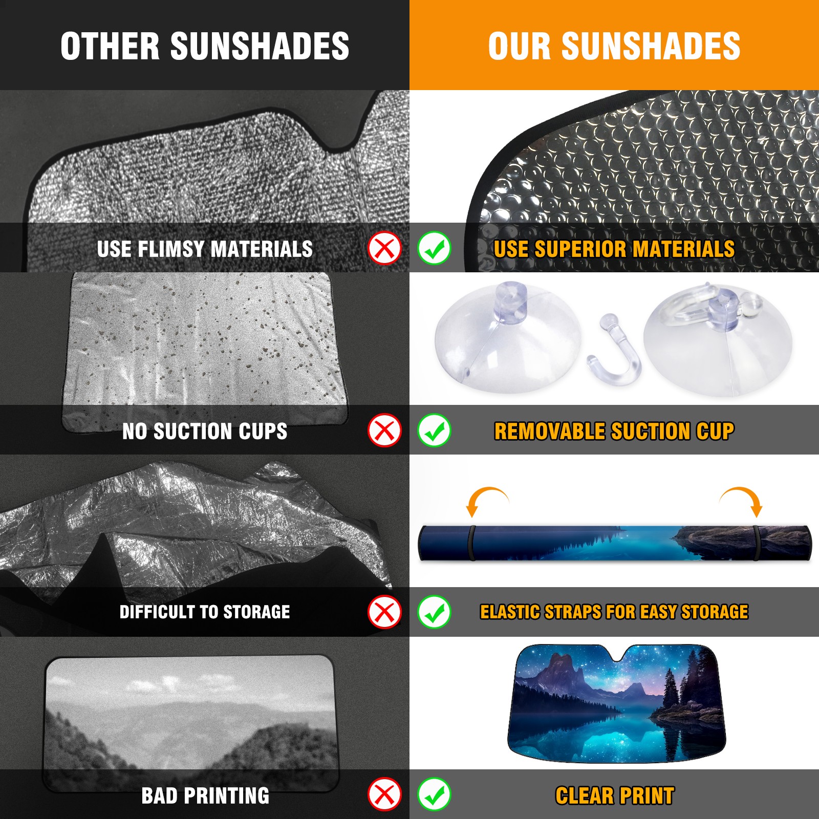 • </b>ZXIVGOQFR Foldable Premium Car Windshield Sunshade is your great solution to reduce your car’s interior temperature dramatically! This is definitely a must-have item for your summer travel! </b> <br> </b>Size: 63"L x 33.5"W </b> <br> </b>Blocking Uv Rays & Heat Insulation</b><br> Our vehicle sunshade provides effective UV, sun, and summer heat protection .Maintains dashboards by preventing fading and cracking <br> </b>Easy-To-Store Folding Design Makes Storage Convenient </b><br> ZXIVGOQFR car sunshades come with removable suction cups and elastic bands that you can install easily and quickly, and the removable suction cups will not leave any marks on your windows when removed. Within seconds, windshield visor can be installed and removed. When not in use,the front windshield can be easily and effectively placed on the door pocket or the dashboard, which is beautiful and does not take up space in the car.<br> <br> </b>PUT UP A 'PROTECTIVE UMBRELLA' FOR YOUR BELOVED CAR!</b>