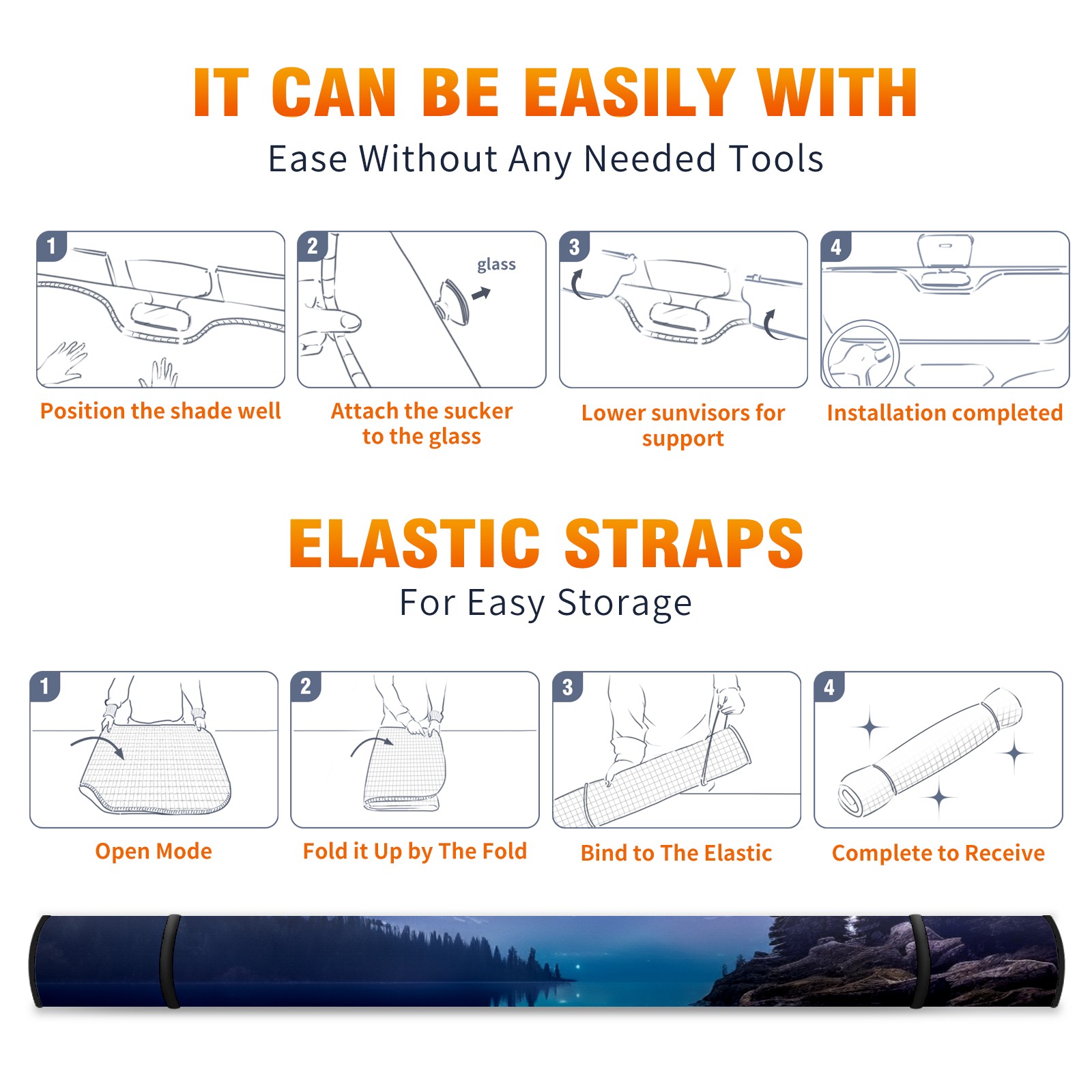 </b>ZXIVGOQFR Foldable Premium Car Windshield Sunshade is your great solution to reduce your car’s interior temperature dramatically! This is definitely a must-have item for your summer travel! </b> <br> </b>Size: 63"L x 33.5"W </b> <br> </b>Blocking Uv Rays & Heat Insulation</b><br> Our vehicle sunshade provides effective UV, sun, and summer heat protection .Maintains dashboards by preventing fading and cracking <br> </b>Easy-To-Store Folding Design Makes Storage Convenient </b><br> ZXIVGOQFR car sunshades come with removable suction cups and elastic bands that you can install easily and quickly, and the removable suction cups will not leave any marks on your windows when removed. Within seconds, windshield visor can be installed and removed. When not in use,the front windshield can be easily and effectively placed on the door pocket or the dashboard, which is beautiful and does not take up space in the car.<br> <br> </b>PUT UP A 'PROTECTIVE UMBRELLA' FOR YOUR BELOVED CAR!</b>