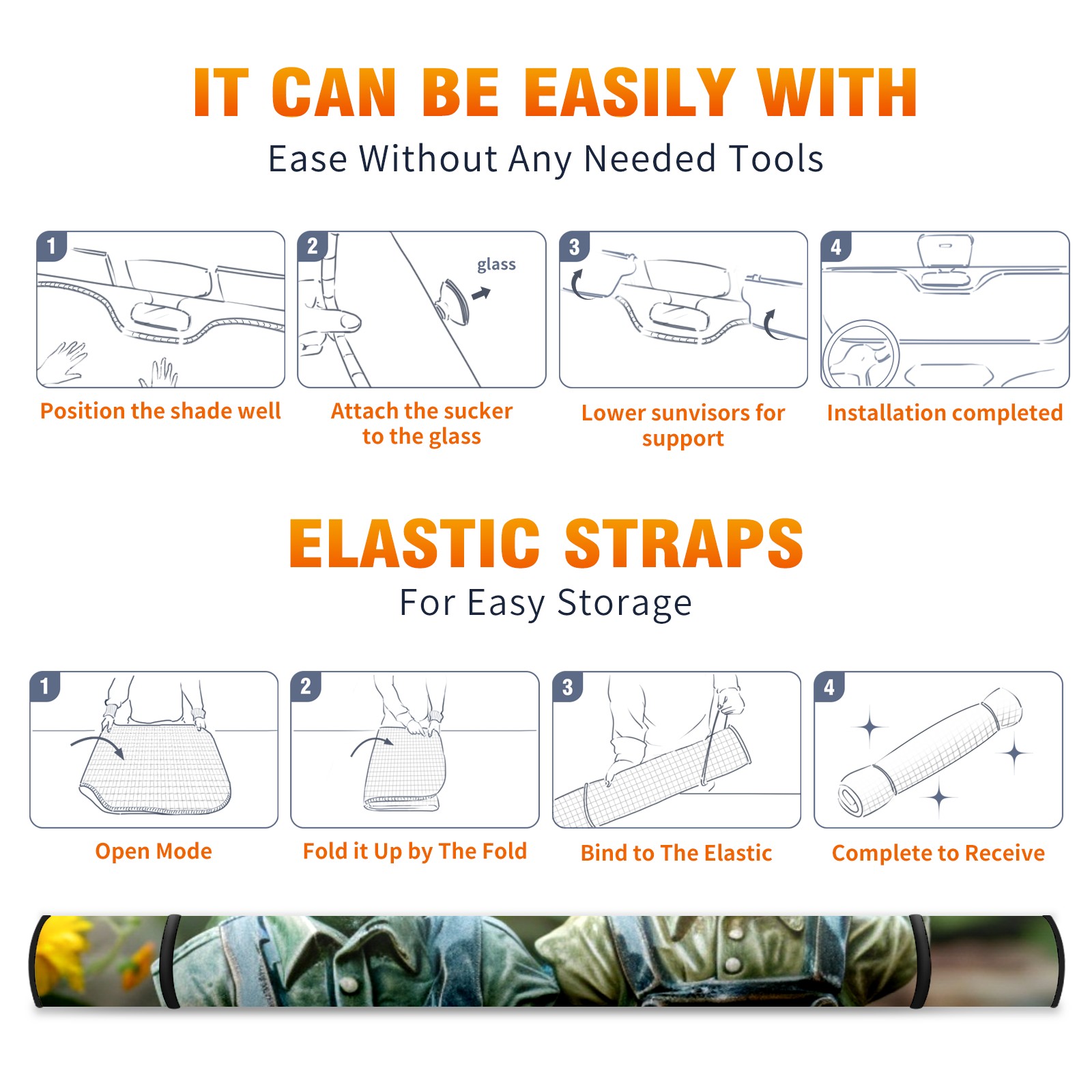 • </b>ZXIVGOQFR Foldable Premium Car Windshield Sunshade is your great solution to reduce your car’s interior temperature dramatically! This is definitely a must-have item for your summer travel! </b> <br> </b>Size: 63"L x 33.5"W </b> <br> </b>Blocking Uv Rays & Heat Insulation</b><br> Our vehicle sunshade provides effective UV, sun, and summer heat protection .Maintains dashboards by preventing fading and cracking <br> </b>Easy-To-Store Folding Design Makes Storage Convenient </b><br> ZXIVGOQFR car sunshades come with removable suction cups and elastic bands that you can install easily and quickly, and the removable suction cups will not leave any marks on your windows when removed. Within seconds, windshield visor can be installed and removed. When not in use,the front windshield can be easily and effectively placed on the door pocket or the dashboard, which is beautiful and does not take up space in the car.<br> <br> </b>PUT UP A 'PROTECTIVE UMBRELLA' FOR YOUR BELOVED CAR!</b>
