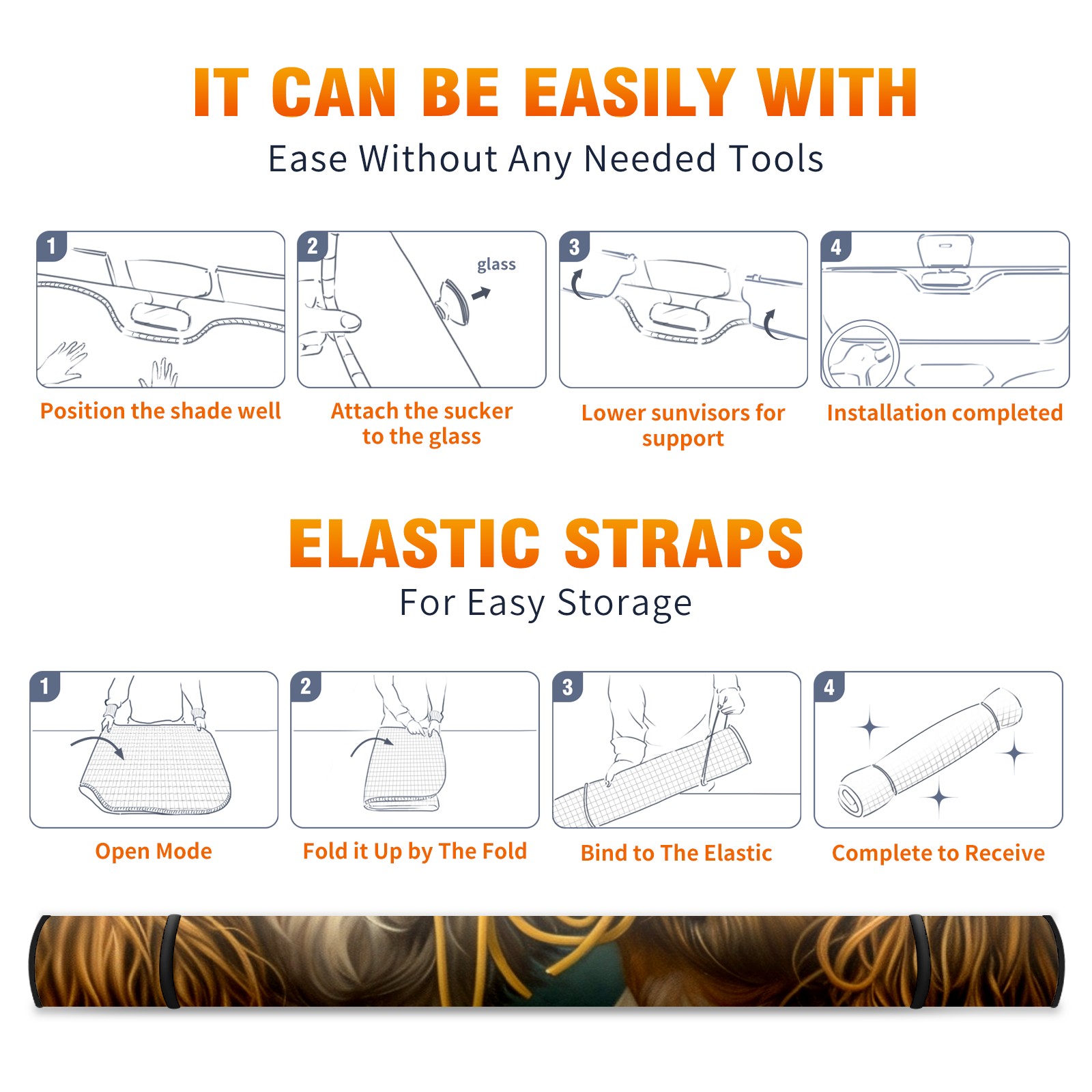 </b>ZXIVGOQFR Foldable Premium Car Windshield Sunshade is your great solution to reduce your car’s interior temperature dramatically! This is definitely a must-have item for your summer travel! </b> <br> </b>Size: 63"L x 33.5"W </b> <br> </b>Blocking Uv Rays & Heat Insulation</b><br> Our vehicle sunshade provides effective UV, sun, and summer heat protection .Maintains dashboards by preventing fading and cracking <br> </b>Easy-To-Store Folding Design Makes Storage Convenient </b><br> ZXIVGOQFR car sunshades come with removable suction cups and elastic bands that you can install easily and quickly, and the removable suction cups will not leave any marks on your windows when removed. Within seconds, windshield visor can be installed and removed. When not in use,the front windshield can be easily and effectively placed on the door pocket or the dashboard, which is beautiful and does not take up space in the car.<br> <br> </b>PUT UP A 'PROTECTIVE UMBRELLA' FOR YOUR BELOVED CAR!</b>