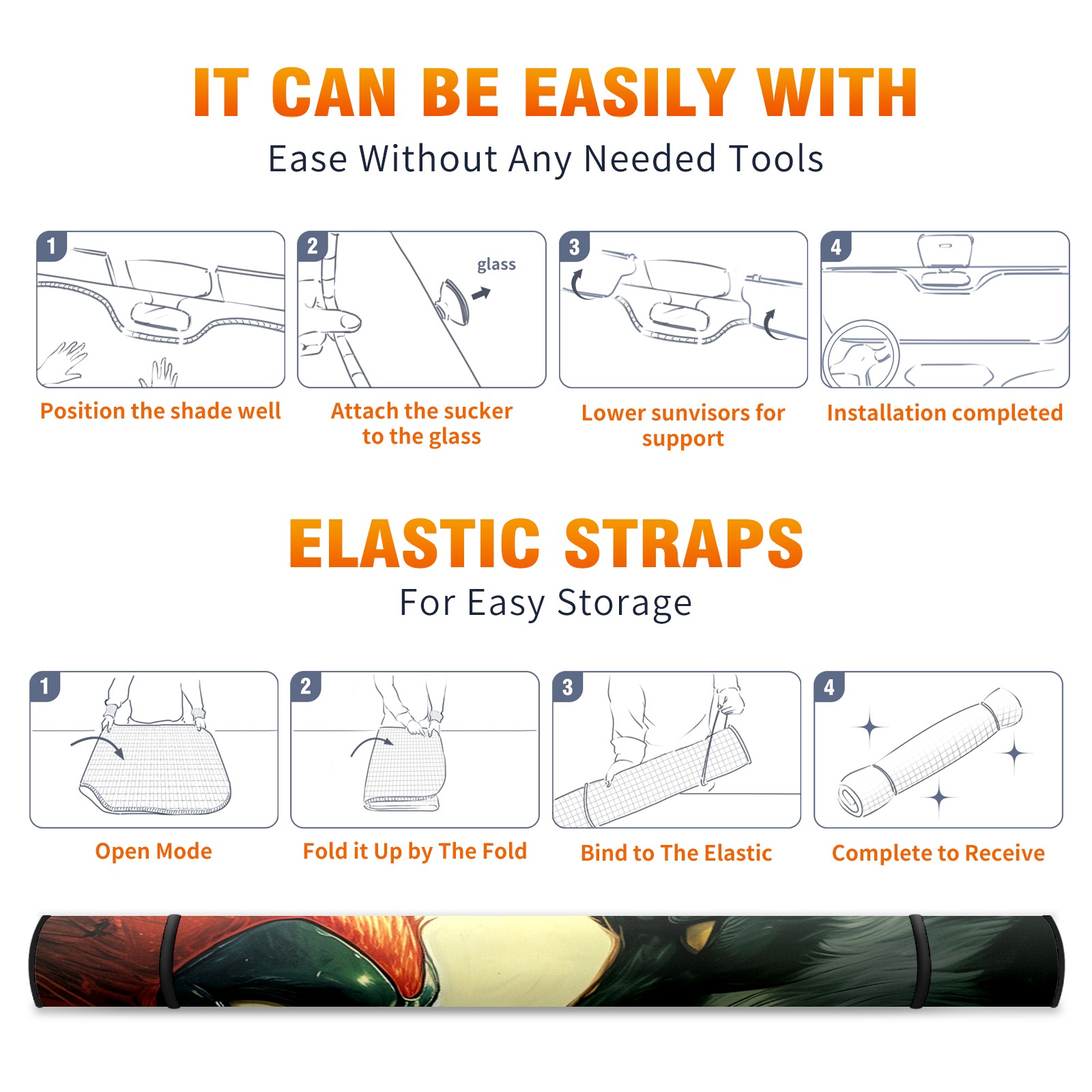 </b>ZXIVGOQFR Foldable Premium Car Windshield Sunshade is your great solution to reduce your car’s interior temperature dramatically! This is definitely a must-have item for your summer travel! </b> <br> </b>Size: 63"L x 33.5"W </b> <br> </b>Blocking Uv Rays & Heat Insulation</b><br> Our vehicle sunshade provides effective UV, sun, and summer heat protection .Maintains dashboards by preventing fading and cracking <br> </b>Easy-To-Store Folding Design Makes Storage Convenient </b><br> ZXIVGOQFR car sunshades come with removable suction cups and elastic bands that you can install easily and quickly, and the removable suction cups will not leave any marks on your windows when removed. Within seconds, windshield visor can be installed and removed. When not in use,the front windshield can be easily and effectively placed on the door pocket or the dashboard, which is beautiful and does not take up space in the car.<br> <br> </b>PUT UP A 'PROTECTIVE UMBRELLA' FOR YOUR BELOVED CAR!</b>