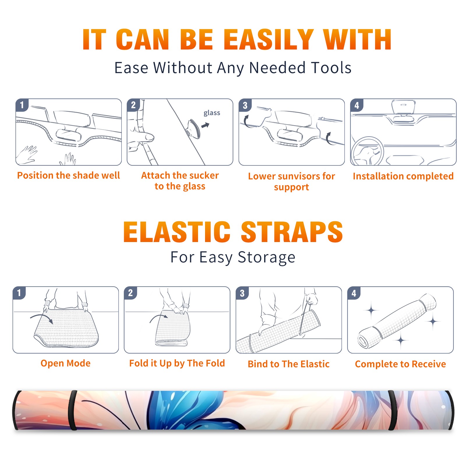 </b>ZXIVGOQFR Foldable Premium Car Windshield Sunshade is your great solution to reduce your car’s interior temperature dramatically! This is definitely a must-have item for your summer travel! </b> <br> </b>Size: 63"L x 33.5"W </b> <br> </b>Blocking Uv Rays & Heat Insulation</b><br> Our vehicle sunshade provides effective UV, sun, and summer heat protection .Maintains dashboards by preventing fading and cracking <br> </b>Easy-To-Store Folding Design Makes Storage Convenient </b><br> ZXIVGOQFR car sunshades come with removable suction cups and elastic bands that you can install easily and quickly, and the removable suction cups will not leave any marks on your windows when removed. Within seconds, windshield visor can be installed and removed. When not in use,the front windshield can be easily and effectively placed on the door pocket or the dashboard, which is beautiful and does not take up space in the car.<br> <br> </b>PUT UP A 'PROTECTIVE UMBRELLA' FOR YOUR BELOVED CAR!</b>