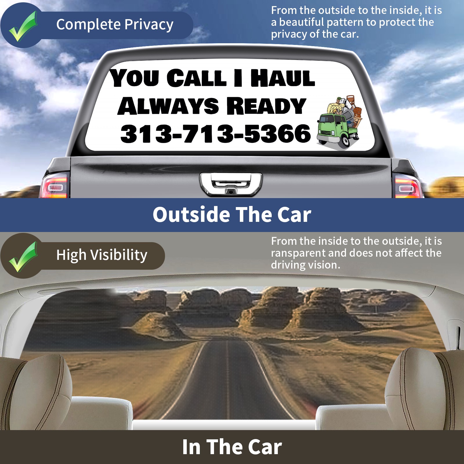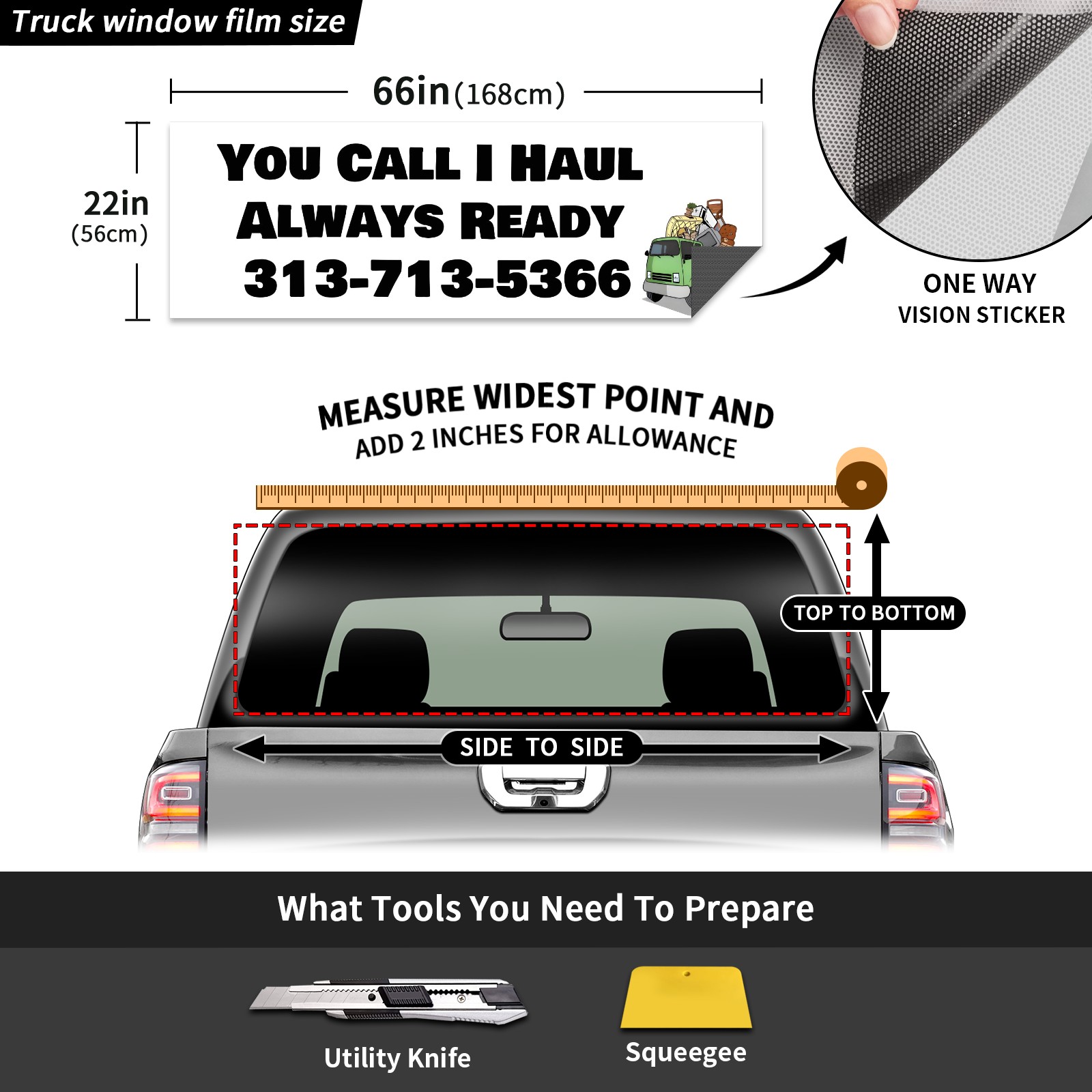 <p><strong>Truck Rear Window Graphics Decals Pickup Trucks Back Window Film Stickers 66" x 22" Perforated Vinyl Wrap Stickers Decorations for Car Rear Window</strong></p><p><strong><br /></strong></p><p><strong>Features :</strong></p><p>- Size of the rear window decals for trucks is 66x22 Inches (168x56cm).</p><p>- High quality perforated vinyl window film, one way vision sticker.</p><p>- Perforated is see through from the inside but not from outside.</p><p>- Clear printing, waterproof and durable.</p><p>- The car back window graphics stickers fits most truck and makes your vehicle more beautiful. </p><p><br /></p><p><strong>【Installation Instructions】</strong></p><p><strong>1. CLEAN SURFACE -</strong> Clean the rear window thoroughly and make sure the surface clean.</p><p><strong>2. STICK THE DECALS -</strong> Tear off the paper on the back and stick the decal on the window.</p><p><strong>3. SCRAPE OFF AIR BUBBLES -</strong> Use a squeegee or other card to scrape off the excess air bubbles.</p><p><strong>4. TRIM THE EXCESS -</strong> Use a knife to cut off the excess stickers of the window, finally complete.</p><p><br /></p><p>1. Please measure the size before purchasing, back window graphics decal for truck can be cut to your desired size.</p><p>2.The graphics stickers for truck back window is a great gift for yourself also can as a birthday / halloween / christmas gift for your friends and family.</p>