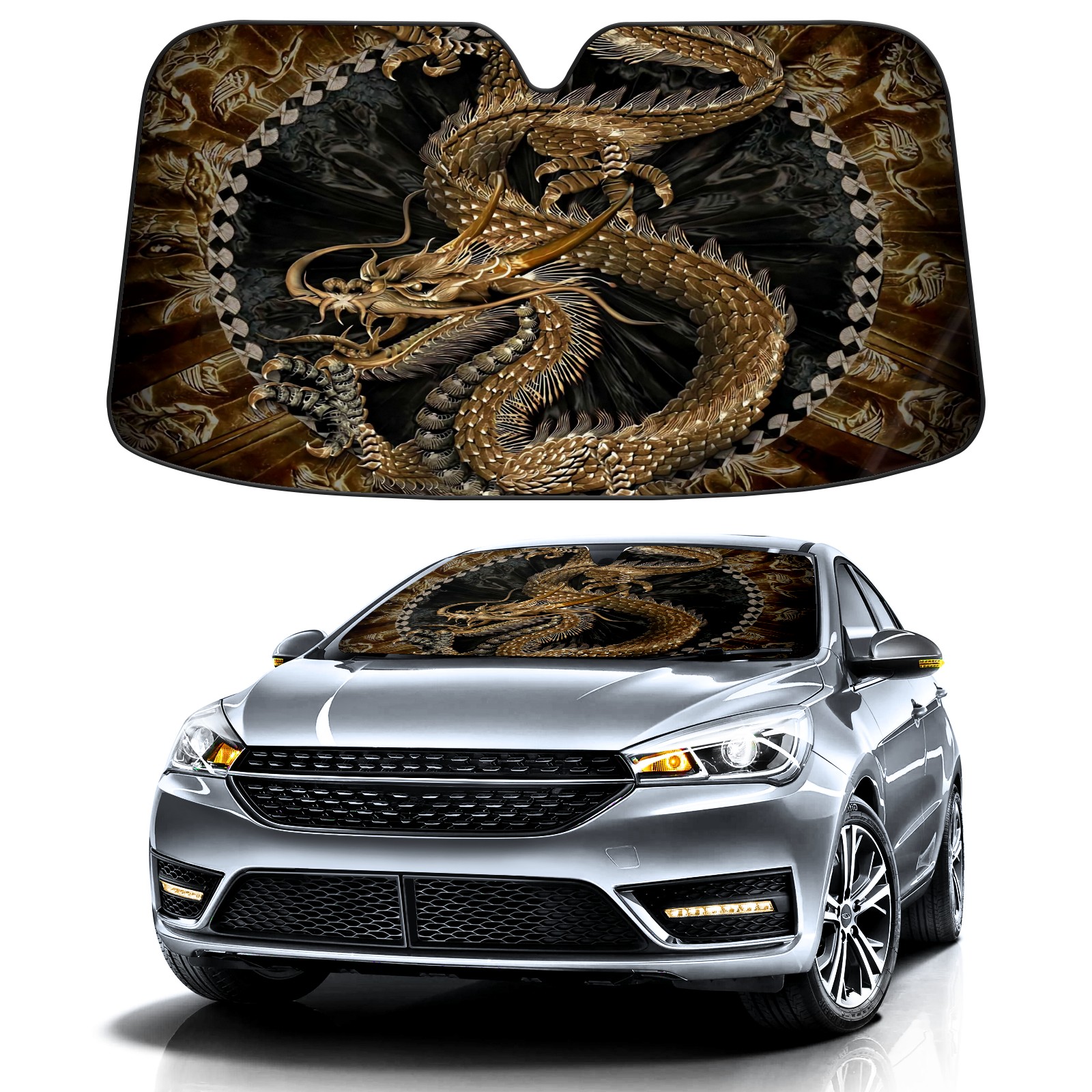 Car Windshield Sun Shade for Front Window Chinese Golden Dragon Foldable Vehicle Windshield Car Sun Visor Covers Automotive Window Protector Car Privacy Sun Blocker
