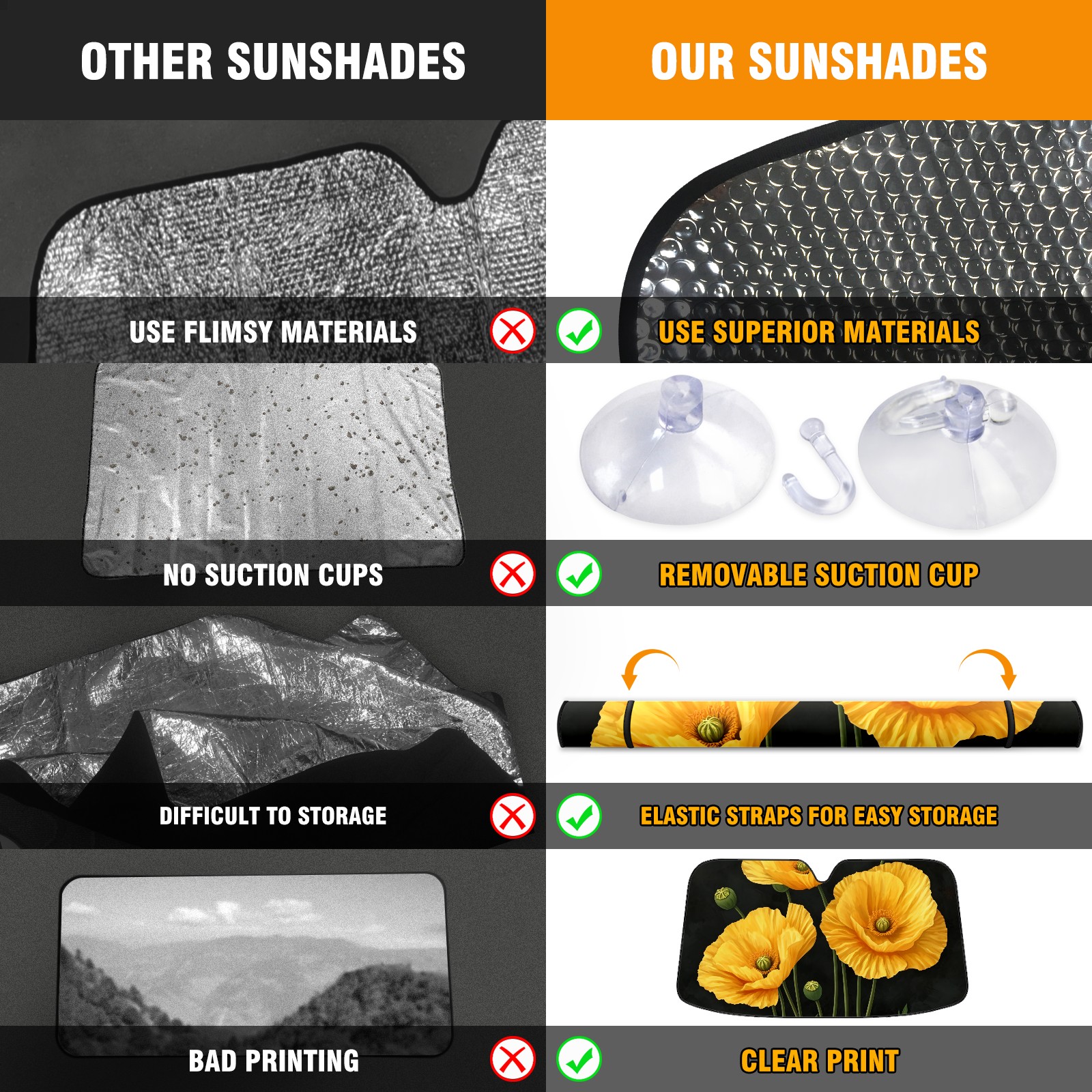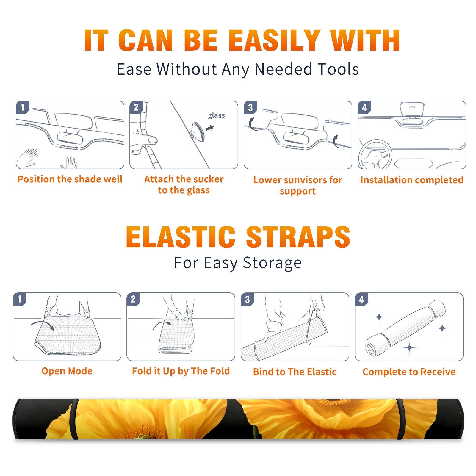 </b>ZXIVGOQFR Foldable Premium Car Windshield Sunshade is your great solution to reduce your car’s interior temperature dramatically! This is definitely a must-have item for your summer travel! </b> <br> </b>Size: 63"L x 33.5"W </b> <br> </b>Blocking Uv Rays & Heat Insulation</b><br> Our vehicle sunshade provides effective UV, sun, and summer heat protection .Maintains dashboards by preventing fading and cracking <br> </b>Easy-To-Store Folding Design Makes Storage Convenient </b><br> ZXIVGOQFR car sunshades come with removable suction cups and elastic bands that you can install easily and quickly, and the removable suction cups will not leave any marks on your windows when removed. Within seconds, windshield visor can be installed and removed. When not in use,the front windshield can be easily and effectively placed on the door pocket or the dashboard, which is beautiful and does not take up space in the car.<br> <br> </b>PUT UP A 'PROTECTIVE UMBRELLA' FOR YOUR BELOVED CAR!</b>