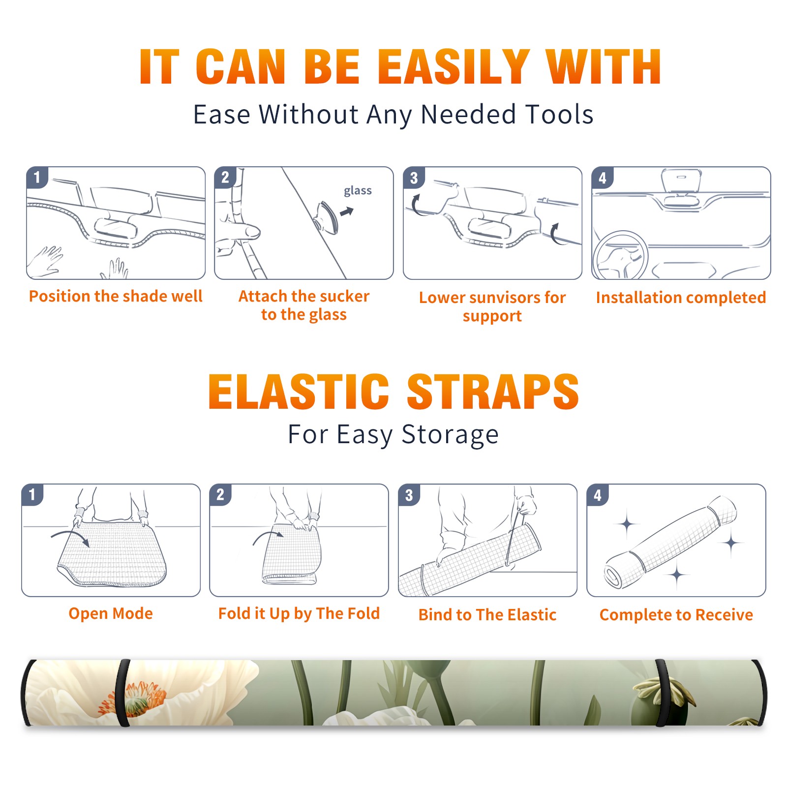 </b>ZXIVGOQFR Foldable Premium Car Windshield Sunshade is your great solution to reduce your car’s interior temperature dramatically! This is definitely a must-have item for your summer travel! </b> <br> </b>Size: 63"L x 33.5"W </b> <br> </b>Blocking Uv Rays & Heat Insulation</b><br> Our vehicle sunshade provides effective UV, sun, and summer heat protection .Maintains dashboards by preventing fading and cracking <br> </b>Easy-To-Store Folding Design Makes Storage Convenient </b><br> ZXIVGOQFR car sunshades come with removable suction cups and elastic bands that you can install easily and quickly, and the removable suction cups will not leave any marks on your windows when removed. Within seconds, windshield visor can be installed and removed. When not in use,the front windshield can be easily and effectively placed on the door pocket or the dashboard, which is beautiful and does not take up space in the car.<br> <br> </b>PUT UP A 'PROTECTIVE UMBRELLA' FOR YOUR BELOVED CAR!</b>