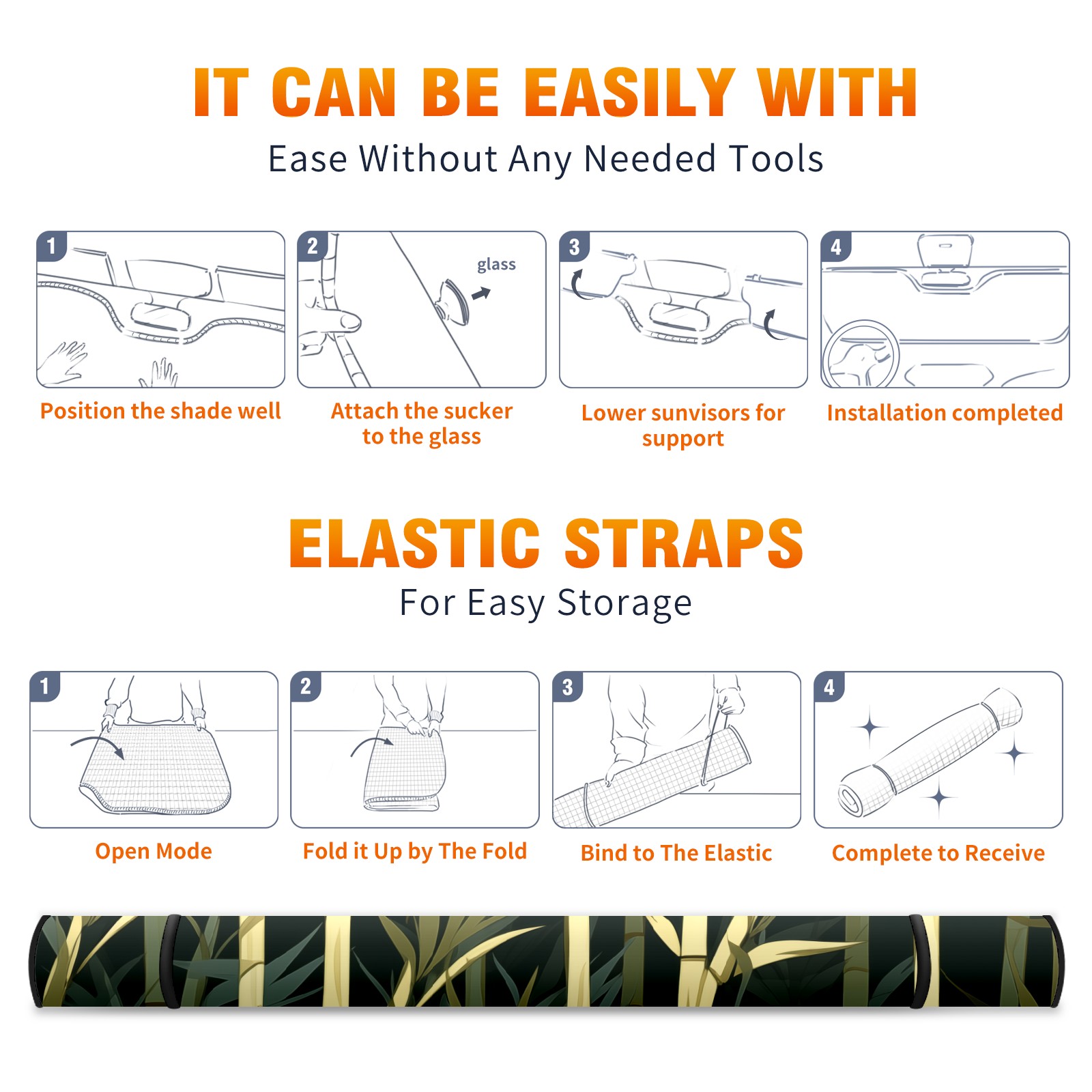 </b>ZXIVGOQFR Foldable Premium Car Windshield Sunshade is your great solution to reduce your car’s interior temperature dramatically! This is definitely a must-have item for your summer travel! </b> <br> </b>Size: 63"L x 33.5"W </b> <br> </b>Blocking Uv Rays & Heat Insulation</b><br> Our vehicle sunshade provides effective UV, sun, and summer heat protection .Maintains dashboards by preventing fading and cracking <br> </b>Easy-To-Store Folding Design Makes Storage Convenient </b><br> ZXIVGOQFR car sunshades come with removable suction cups and elastic bands that you can install easily and quickly, and the removable suction cups will not leave any marks on your windows when removed. Within seconds, windshield visor can be installed and removed. When not in use,the front windshield can be easily and effectively placed on the door pocket or the dashboard, which is beautiful and does not take up space in the car.<br> <br> </b>PUT UP A 'PROTECTIVE UMBRELLA' FOR YOUR BELOVED CAR!</b>