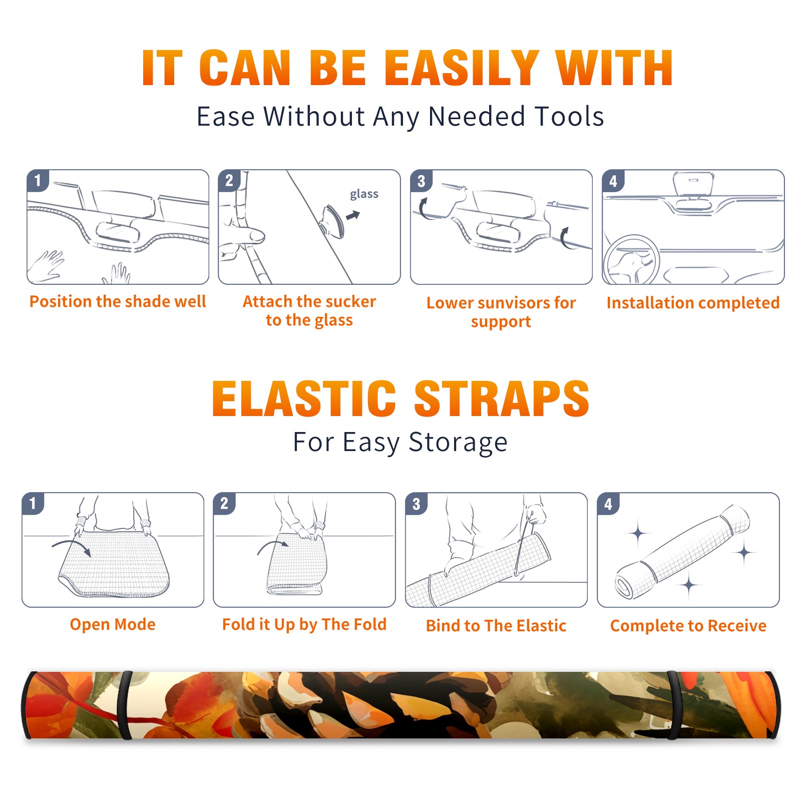 • </b>ZXIVGOQFR Foldable Premium Car Windshield Sunshade is your great solution to reduce your car’s interior temperature dramatically! This is definitely a must-have item for your summer travel! </b> <br> </b>Size: 63"L x 33.5"W </b> <br> </b>Blocking Uv Rays & Heat Insulation</b><br> Our vehicle sunshade provides effective UV, sun, and summer heat protection .Maintains dashboards by preventing fading and cracking <br> </b>Easy-To-Store Folding Design Makes Storage Convenient </b><br> ZXIVGOQFR car sunshades come with removable suction cups and elastic bands that you can install easily and quickly, and the removable suction cups will not leave any marks on your windows when removed. Within seconds, windshield visor can be installed and removed. When not in use,the front windshield can be easily and effectively placed on the door pocket or the dashboard, which is beautiful and does not take up space in the car.<br> <br> </b>PUT UP A 'PROTECTIVE UMBRELLA' FOR YOUR BELOVED CAR!</b>