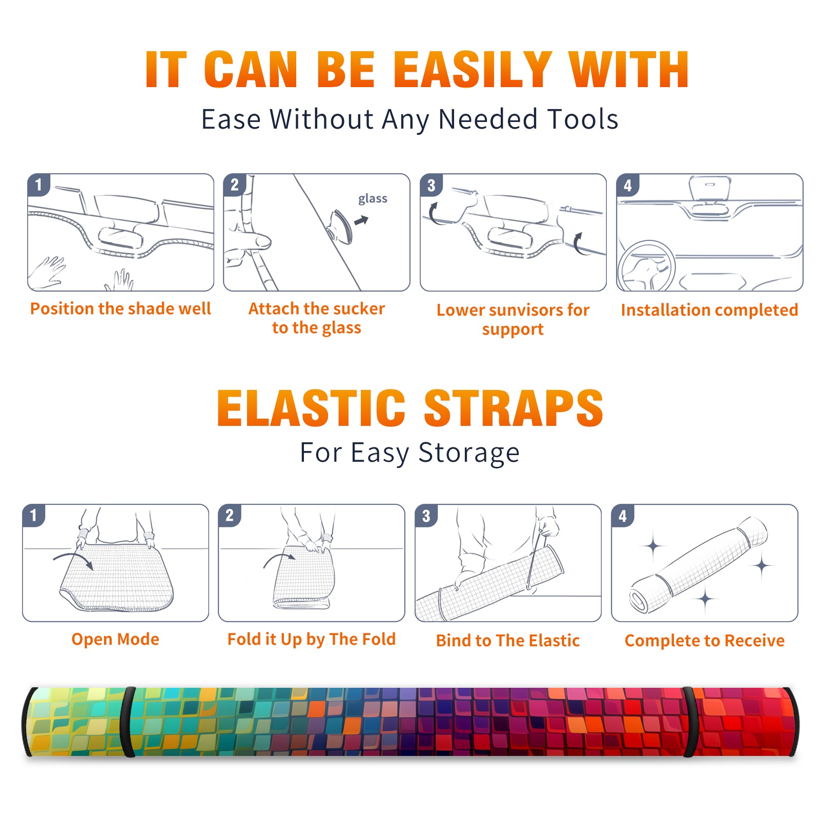 • </b>ZXIVGOQFR Foldable Premium Car Windshield Sunshade is your great solution to reduce your car’s interior temperature dramatically! This is definitely a must-have item for your summer travel! </b> <br> </b>Size: 63"L x 33.5"W </b> <br> </b>Blocking Uv Rays & Heat Insulation</b><br> Our vehicle sunshade provides effective UV, sun, and summer heat protection .Maintains dashboards by preventing fading and cracking <br> </b>Easy-To-Store Folding Design Makes Storage Convenient </b><br> ZXIVGOQFR car sunshades come with removable suction cups and elastic bands that you can install easily and quickly, and the removable suction cups will not leave any marks on your windows when removed. Within seconds, windshield visor can be installed and removed. When not in use,the front windshield can be easily and effectively placed on the door pocket or the dashboard, which is beautiful and does not take up space in the car.<br> <br> </b>PUT UP A 'PROTECTIVE UMBRELLA' FOR YOUR BELOVED CAR!</b>