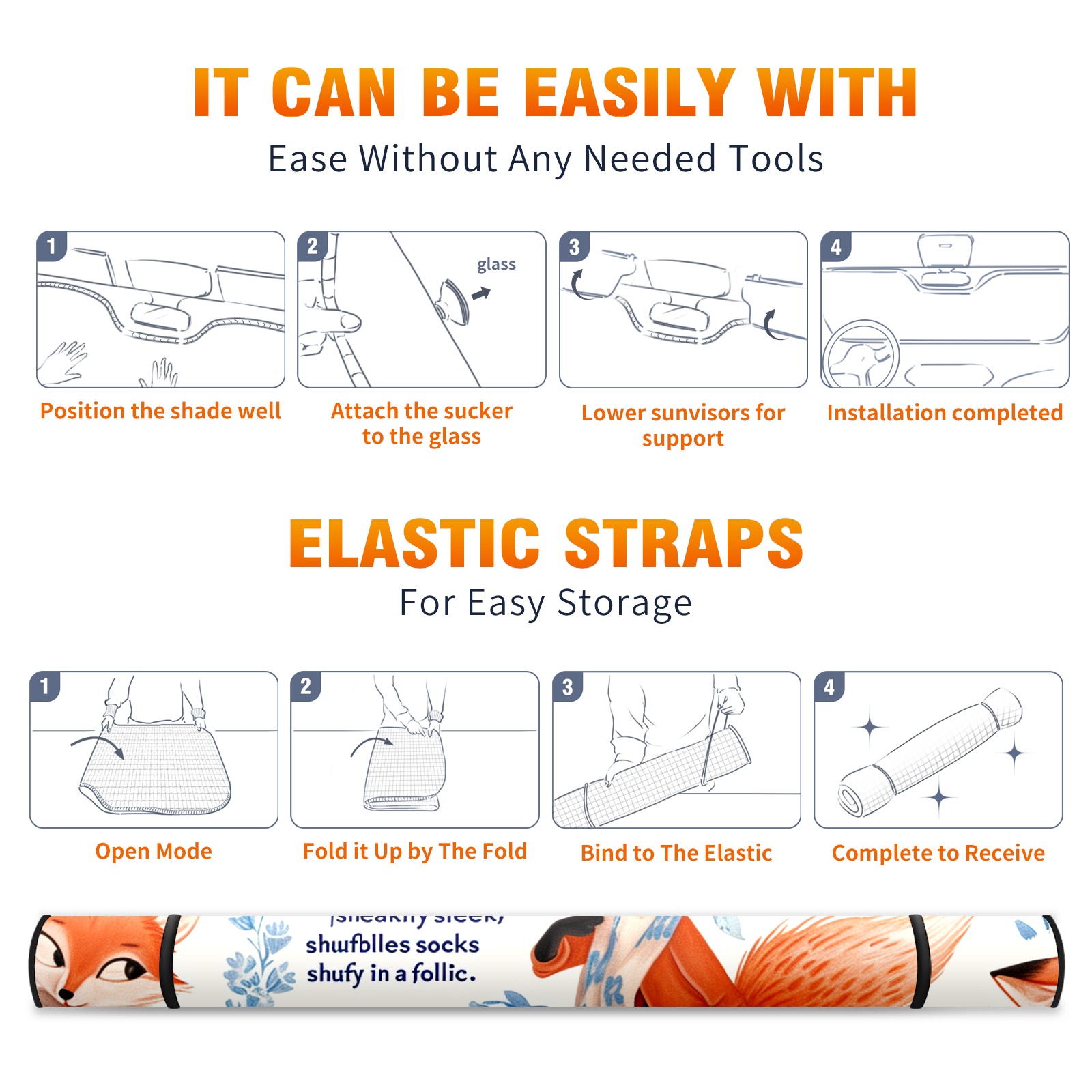 • </b>ZXIVGOQFR Foldable Premium Car Windshield Sunshade is your great solution to reduce your car’s interior temperature dramatically! This is definitely a must-have item for your summer travel! </b> <br> </b>Size: 63"L x 33.5"W </b> <br> </b>Blocking Uv Rays & Heat Insulation</b><br> Our vehicle sunshade provides effective UV, sun, and summer heat protection .Maintains dashboards by preventing fading and cracking <br> </b>Easy-To-Store Folding Design Makes Storage Convenient </b><br> ZXIVGOQFR car sunshades come with removable suction cups and elastic bands that you can install easily and quickly, and the removable suction cups will not leave any marks on your windows when removed. Within seconds, windshield visor can be installed and removed. When not in use,the front windshield can be easily and effectively placed on the door pocket or the dashboard, which is beautiful and does not take up space in the car.<br> <br> </b>PUT UP A 'PROTECTIVE UMBRELLA' FOR YOUR BELOVED CAR!</b>