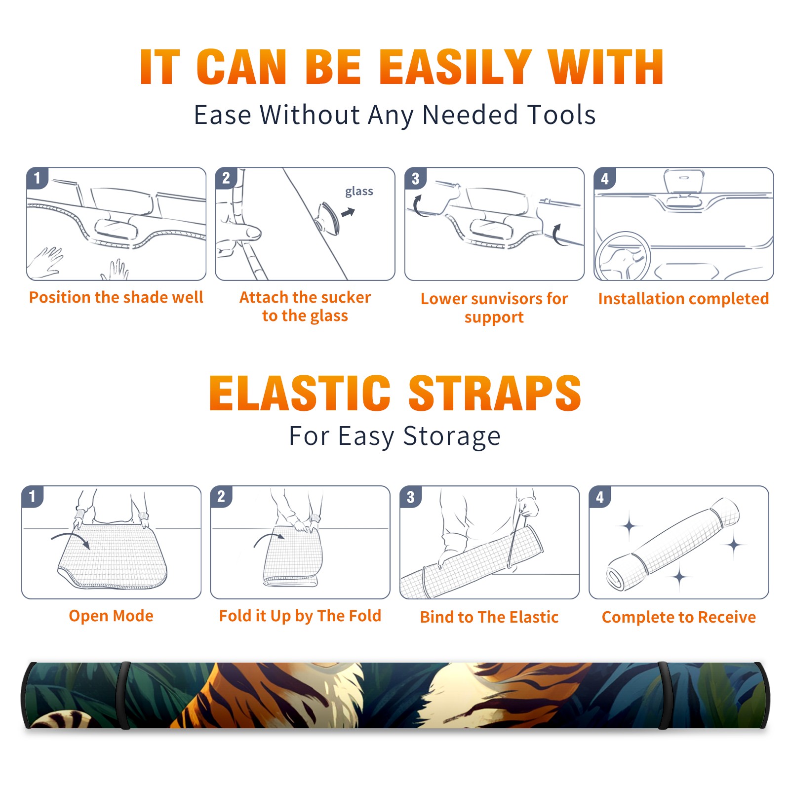 </b>ZXIVGOQFR Foldable Premium Car Windshield Sunshade is your great solution to reduce your car’s interior temperature dramatically! This is definitely a must-have item for your summer travel! </b> <br> </b>Size: 63"L x 33.5"W </b> <br> </b>Blocking Uv Rays & Heat Insulation</b><br> Our vehicle sunshade provides effective UV, sun, and summer heat protection .Maintains dashboards by preventing fading and cracking <br> </b>Easy-To-Store Folding Design Makes Storage Convenient </b><br> ZXIVGOQFR car sunshades come with removable suction cups and elastic bands that you can install easily and quickly, and the removable suction cups will not leave any marks on your windows when removed. Within seconds, windshield visor can be installed and removed. When not in use,the front windshield can be easily and effectively placed on the door pocket or the dashboard, which is beautiful and does not take up space in the car.<br> <br> </b>PUT UP A 'PROTECTIVE UMBRELLA' FOR YOUR BELOVED CAR!</b>