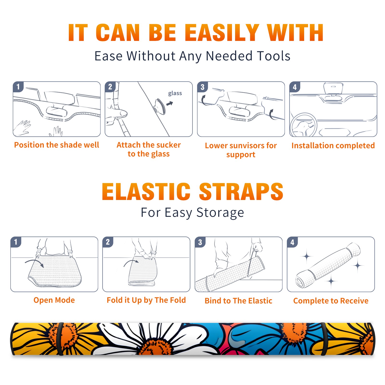 • </b>ZXIVGOQFR Foldable Premium Car Windshield Sunshade is your great solution to reduce your car’s interior temperature dramatically! This is definitely a must-have item for your summer travel! </b> <br> </b>Size: 63"L x 33.5"W </b> <br> </b>Blocking Uv Rays & Heat Insulation</b><br> Our vehicle sunshade provides effective UV, sun, and summer heat protection .Maintains dashboards by preventing fading and cracking <br> </b>Easy-To-Store Folding Design Makes Storage Convenient </b><br> ZXIVGOQFR car sunshades come with removable suction cups and elastic bands that you can install easily and quickly, and the removable suction cups will not leave any marks on your windows when removed. Within seconds, windshield visor can be installed and removed. When not in use,the front windshield can be easily and effectively placed on the door pocket or the dashboard, which is beautiful and does not take up space in the car.<br> <br> </b>PUT UP A 'PROTECTIVE UMBRELLA' FOR YOUR BELOVED CAR!</b>