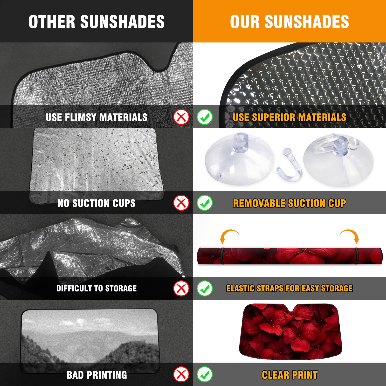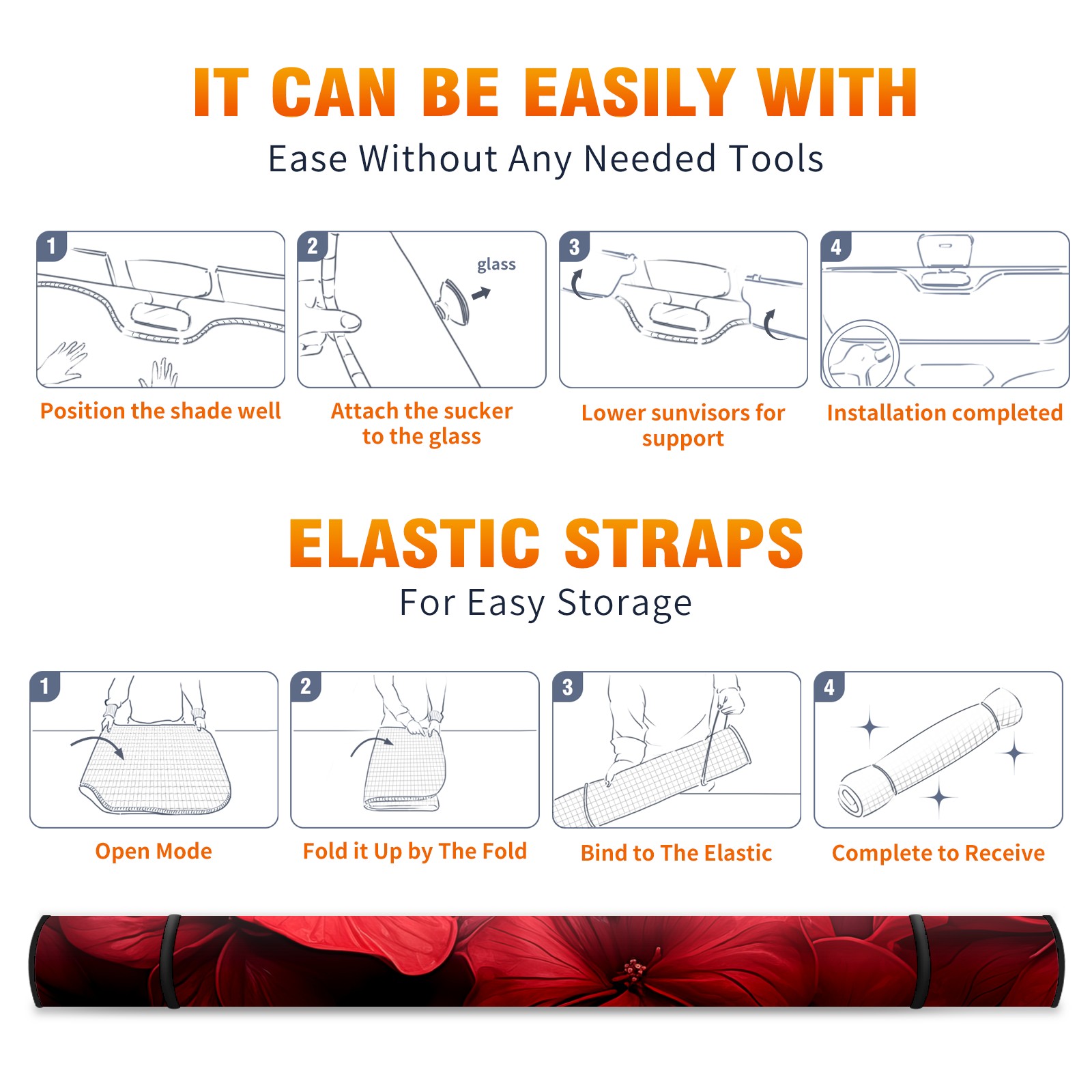 • </b>ZXIVGOQFR Foldable Premium Car Windshield Sunshade is your great solution to reduce your car’s interior temperature dramatically! This is definitely a must-have item for your summer travel! </b> <br> </b>Size: 63"L x 33.5"W </b> <br> </b>Blocking Uv Rays & Heat Insulation</b><br> Our vehicle sunshade provides effective UV, sun, and summer heat protection .Maintains dashboards by preventing fading and cracking <br> </b>Easy-To-Store Folding Design Makes Storage Convenient </b><br> ZXIVGOQFR car sunshades come with removable suction cups and elastic bands that you can install easily and quickly, and the removable suction cups will not leave any marks on your windows when removed. Within seconds, windshield visor can be installed and removed. When not in use,the front windshield can be easily and effectively placed on the door pocket or the dashboard, which is beautiful and does not take up space in the car.<br> <br> </b>PUT UP A 'PROTECTIVE UMBRELLA' FOR YOUR BELOVED CAR!</b>