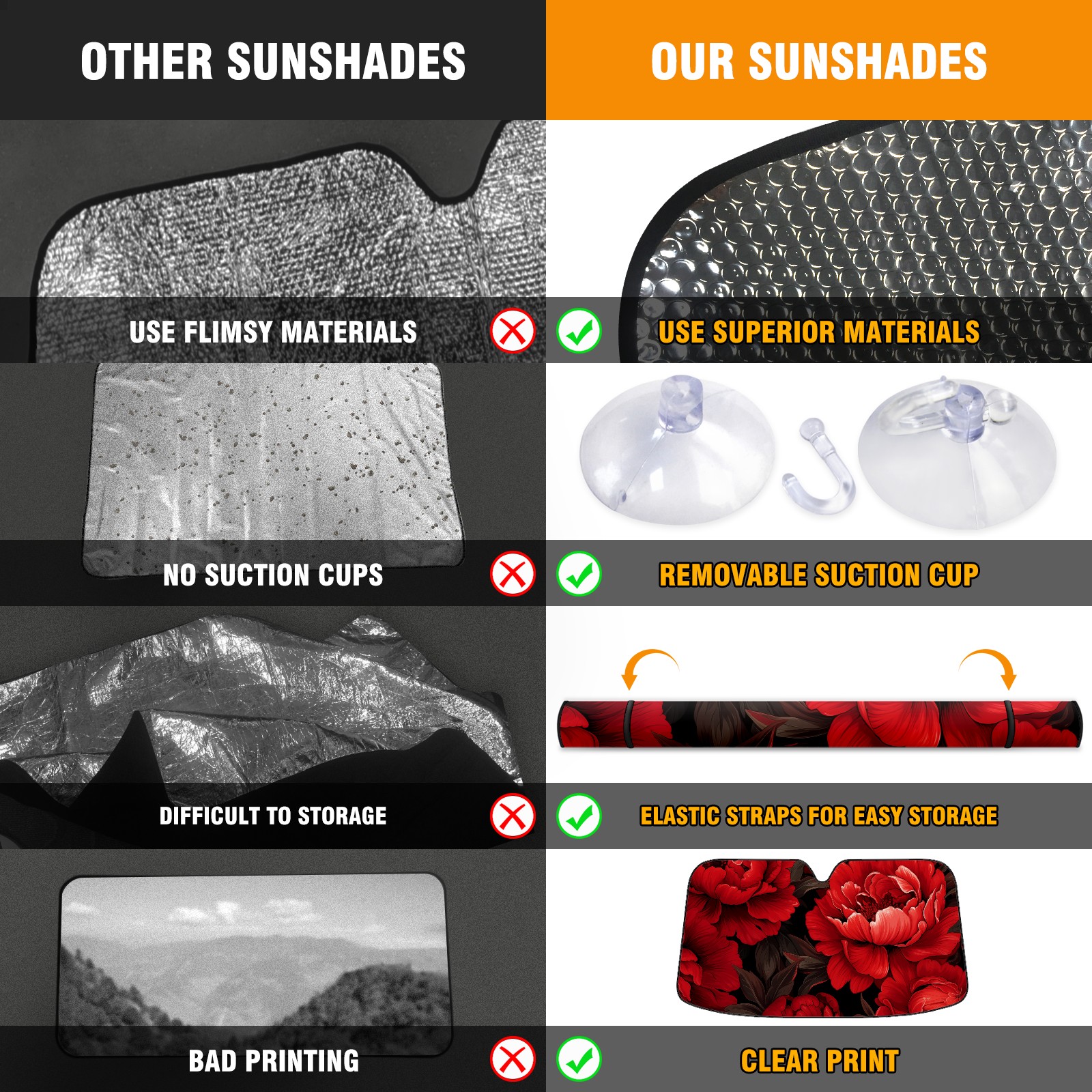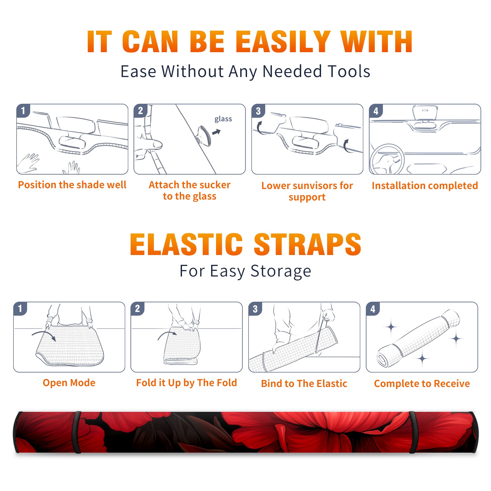 • </b>ZXIVGOQFR Foldable Premium Car Windshield Sunshade is your great solution to reduce your car’s interior temperature dramatically! This is definitely a must-have item for your summer travel! </b> <br> </b>Size: 63"L x 33.5"W </b> <br> </b>Blocking Uv Rays & Heat Insulation</b><br> Our vehicle sunshade provides effective UV, sun, and summer heat protection .Maintains dashboards by preventing fading and cracking <br> </b>Easy-To-Store Folding Design Makes Storage Convenient </b><br> ZXIVGOQFR car sunshades come with removable suction cups and elastic bands that you can install easily and quickly, and the removable suction cups will not leave any marks on your windows when removed. Within seconds, windshield visor can be installed and removed. When not in use,the front windshield can be easily and effectively placed on the door pocket or the dashboard, which is beautiful and does not take up space in the car.<br> <br> </b>PUT UP A 'PROTECTIVE UMBRELLA' FOR YOUR BELOVED CAR!</b>