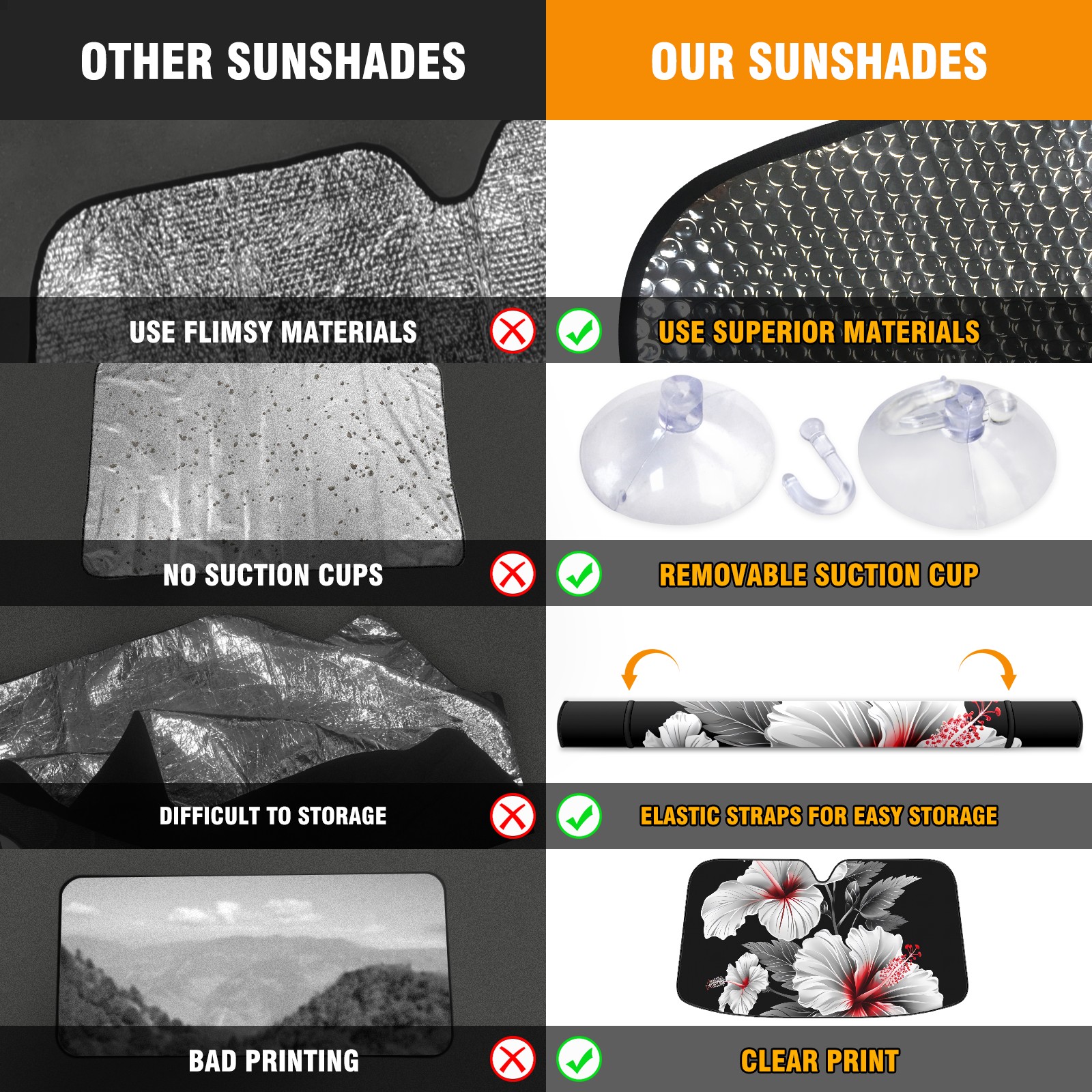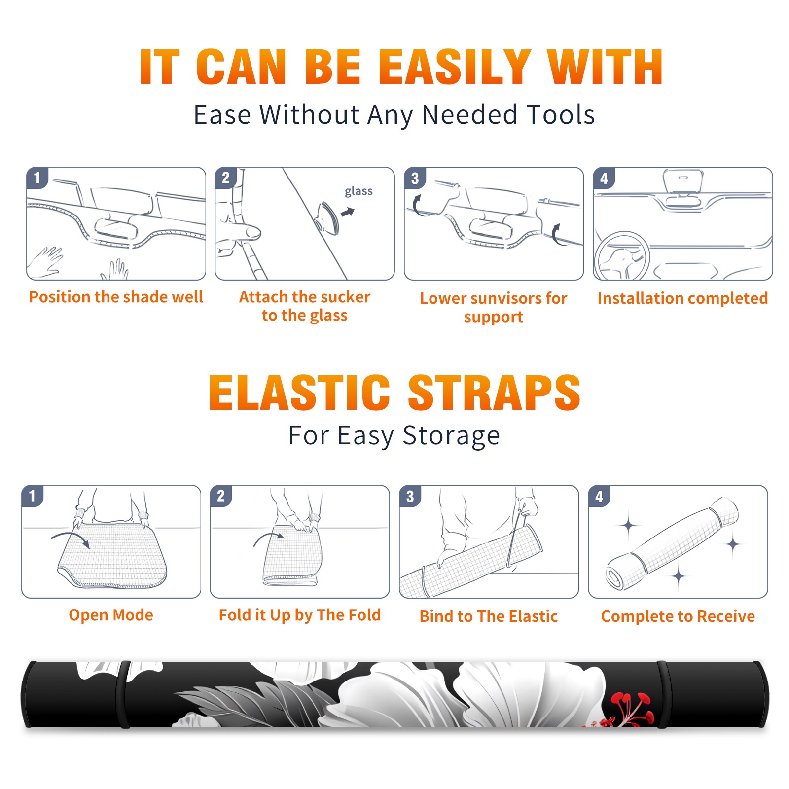 • </b>ZXIVGOQFR Foldable Premium Car Windshield Sunshade is your great solution to reduce your car’s interior temperature dramatically! This is definitely a must-have item for your summer travel! </b> <br> </b>Size: 63"L x 33.5"W </b> <br> </b>Blocking Uv Rays & Heat Insulation</b><br> Our vehicle sunshade provides effective UV, sun, and summer heat protection .Maintains dashboards by preventing fading and cracking <br> </b>Easy-To-Store Folding Design Makes Storage Convenient </b><br> ZXIVGOQFR car sunshades come with removable suction cups and elastic bands that you can install easily and quickly, and the removable suction cups will not leave any marks on your windows when removed. Within seconds, windshield visor can be installed and removed. When not in use,the front windshield can be easily and effectively placed on the door pocket or the dashboard, which is beautiful and does not take up space in the car.<br> <br> </b>PUT UP A 'PROTECTIVE UMBRELLA' FOR YOUR BELOVED CAR!</b>