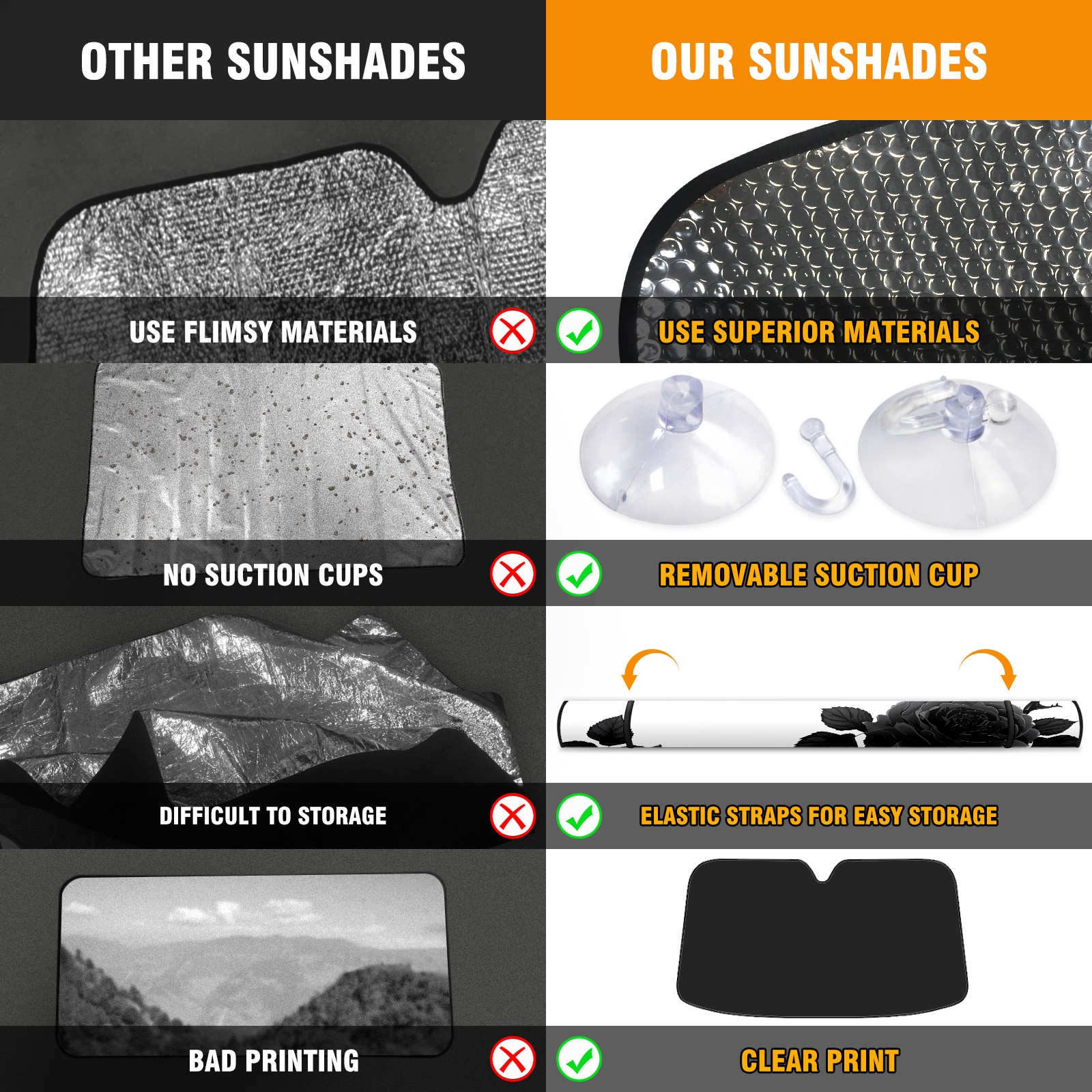 • </b>ZXIVGOQFR Foldable Premium Car Windshield Sunshade is your great solution to reduce your car’s interior temperature dramatically! This is definitely a must-have item for your summer travel! </b> <br> </b>Size: 63"L x 33.5"W </b> <br> </b>Blocking Uv Rays & Heat Insulation</b><br> Our vehicle sunshade provides effective UV, sun, and summer heat protection .Maintains dashboards by preventing fading and cracking <br> </b>Easy-To-Store Folding Design Makes Storage Convenient </b><br> ZXIVGOQFR car sunshades come with removable suction cups and elastic bands that you can install easily and quickly, and the removable suction cups will not leave any marks on your windows when removed. Within seconds, windshield visor can be installed and removed. When not in use,the front windshield can be easily and effectively placed on the door pocket or the dashboard, which is beautiful and does not take up space in the car.<br> <br> </b>PUT UP A 'PROTECTIVE UMBRELLA' FOR YOUR BELOVED CAR!</b>