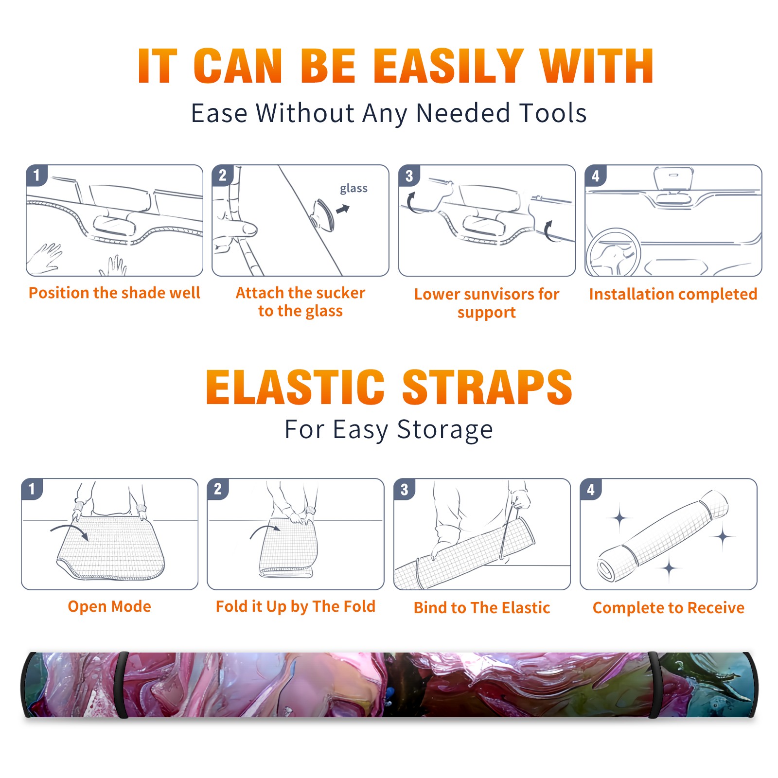 • </b>ZXIVGOQFR Foldable Premium Car Windshield Sunshade is your great solution to reduce your car’s interior temperature dramatically! This is definitely a must-have item for your summer travel! </b> <br> </b>Size: 63"L x 33.5"W </b> <br> </b>Blocking Uv Rays & Heat Insulation</b><br> Our vehicle sunshade provides effective UV, sun, and summer heat protection .Maintains dashboards by preventing fading and cracking <br> </b>Easy-To-Store Folding Design Makes Storage Convenient </b><br> ZXIVGOQFR car sunshades come with removable suction cups and elastic bands that you can install easily and quickly, and the removable suction cups will not leave any marks on your windows when removed. Within seconds, windshield visor can be installed and removed. When not in use,the front windshield can be easily and effectively placed on the door pocket or the dashboard, which is beautiful and does not take up space in the car.<br> <br> </b>PUT UP A 'PROTECTIVE UMBRELLA' FOR YOUR BELOVED CAR!</b>