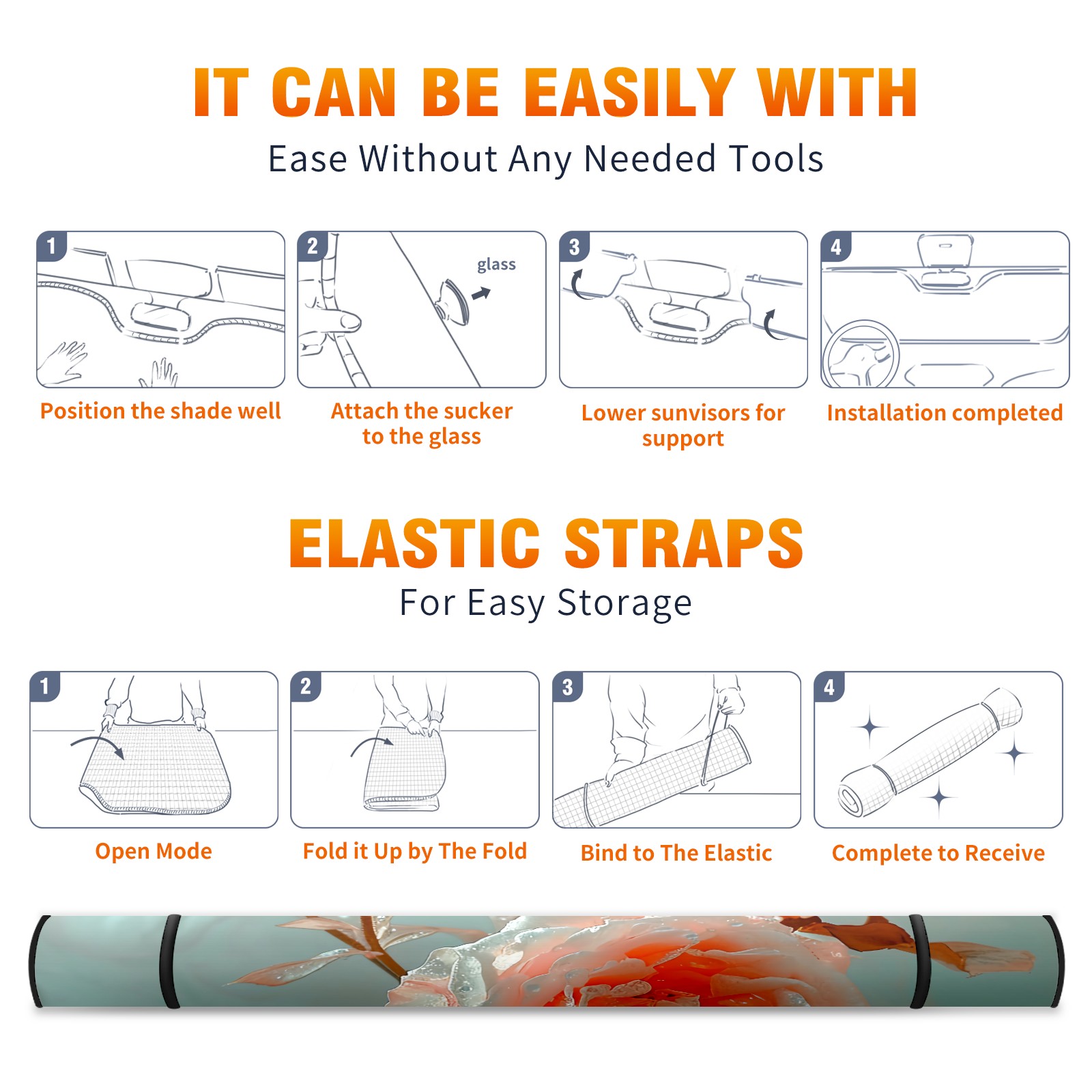 </b>ZXIVGOQFR Foldable Premium Car Windshield Sunshade is your great solution to reduce your car’s interior temperature dramatically! This is definitely a must-have item for your summer travel! </b> <br> </b>Size: 63"L x 33.5"W </b> <br> </b>Blocking Uv Rays & Heat Insulation</b><br> Our vehicle sunshade provides effective UV, sun, and summer heat protection .Maintains dashboards by preventing fading and cracking <br> </b>Easy-To-Store Folding Design Makes Storage Convenient </b><br> ZXIVGOQFR car sunshades come with removable suction cups and elastic bands that you can install easily and quickly, and the removable suction cups will not leave any marks on your windows when removed. Within seconds, windshield visor can be installed and removed. When not in use,the front windshield can be easily and effectively placed on the door pocket or the dashboard, which is beautiful and does not take up space in the car.<br> <br> </b>PUT UP A 'PROTECTIVE UMBRELLA' FOR YOUR BELOVED CAR!</b>