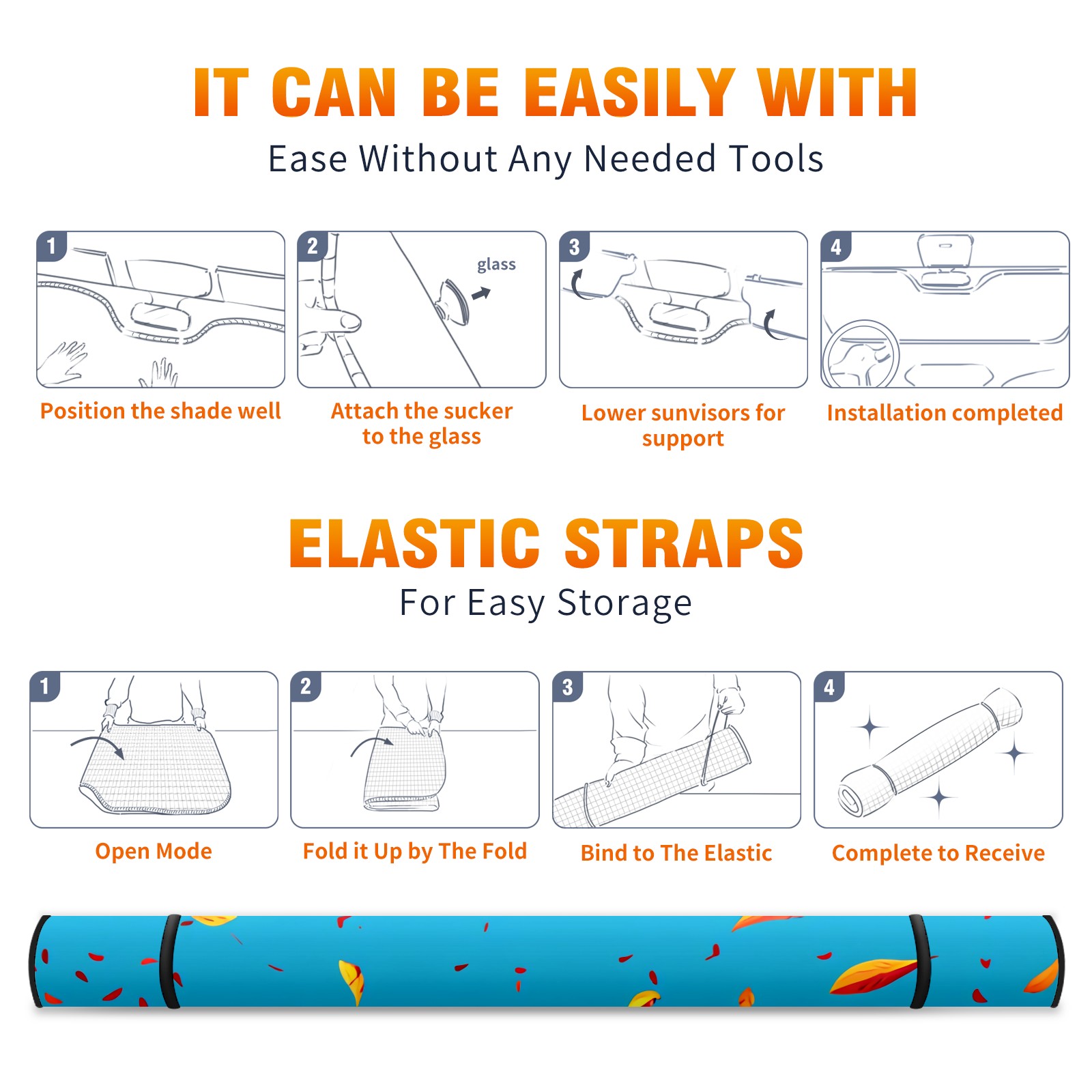 • </b>ZXIVGOQFR Foldable Premium Car Windshield Sunshade is your great solution to reduce your car’s interior temperature dramatically! This is definitely a must-have item for your summer travel! </b> <br> </b>Size: 63"L x 33.5"W </b> <br> </b>Blocking Uv Rays & Heat Insulation</b><br> Our vehicle sunshade provides effective UV, sun, and summer heat protection .Maintains dashboards by preventing fading and cracking <br> </b>Easy-To-Store Folding Design Makes Storage Convenient </b><br> ZXIVGOQFR car sunshades come with removable suction cups and elastic bands that you can install easily and quickly, and the removable suction cups will not leave any marks on your windows when removed. Within seconds, windshield visor can be installed and removed. When not in use,the front windshield can be easily and effectively placed on the door pocket or the dashboard, which is beautiful and does not take up space in the car.<br> <br> </b>PUT UP A 'PROTECTIVE UMBRELLA' FOR YOUR BELOVED CAR!</b>