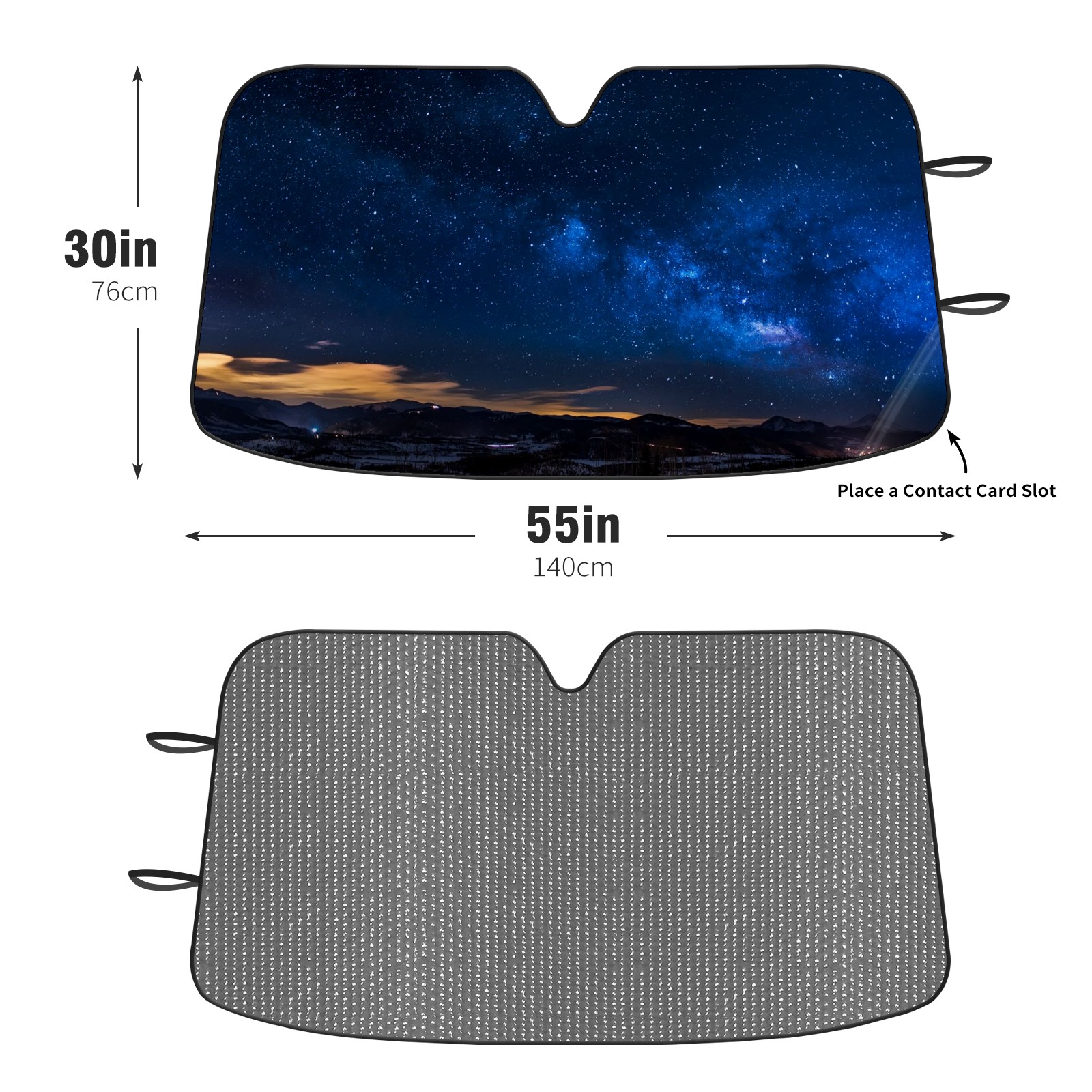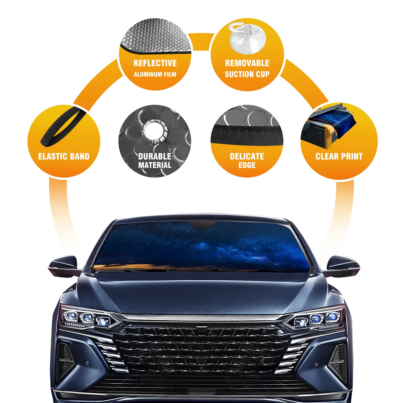 </b>ZXIVGOQFR Foldable Premium Car Windshield Sunshade is your great solution to reduce your car’s interior temperature dramatically! This is definitely a must-have item for your summer travel! </b> <br> </b>Size: 63"L x 33.5"W </b> <br> </b>Blocking Uv Rays & Heat Insulation</b><br> Our vehicle sunshade provides effective UV, sun, and summer heat protection .Maintains dashboards by preventing fading and cracking <br> </b>Easy-To-Store Folding Design Makes Storage Convenient </b><br> ZXIVGOQFR car sunshades come with removable suction cups and elastic bands that you can install easily and quickly, and the removable suction cups will not leave any marks on your windows when removed. Within seconds, windshield visor can be installed and removed. When not in use,the front windshield can be easily and effectively placed on the door pocket or the dashboard, which is beautiful and does not take up space in the car.<br> <br> </b>PUT UP A 'PROTECTIVE UMBRELLA' FOR YOUR BELOVED CAR!</b>