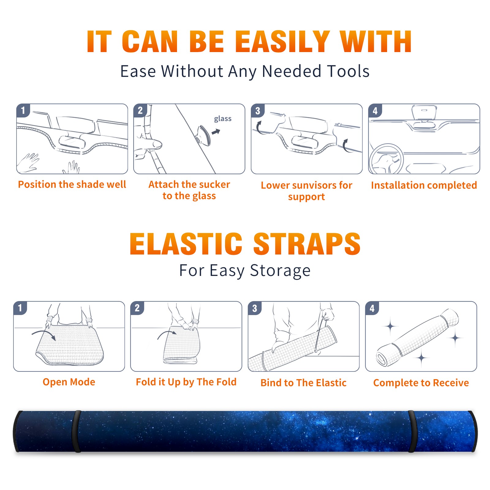 • </b>ZXIVGOQFR Foldable Premium Car Windshield Sunshade is your great solution to reduce your car’s interior temperature dramatically! This is definitely a must-have item for your summer travel! </b> <br> </b>Size: 63"L x 33.5"W </b> <br> </b>Blocking Uv Rays & Heat Insulation</b><br> Our vehicle sunshade provides effective UV, sun, and summer heat protection .Maintains dashboards by preventing fading and cracking <br> </b>Easy-To-Store Folding Design Makes Storage Convenient </b><br> ZXIVGOQFR car sunshades come with removable suction cups and elastic bands that you can install easily and quickly, and the removable suction cups will not leave any marks on your windows when removed. Within seconds, windshield visor can be installed and removed. When not in use,the front windshield can be easily and effectively placed on the door pocket or the dashboard, which is beautiful and does not take up space in the car.<br> <br> </b>PUT UP A 'PROTECTIVE UMBRELLA' FOR YOUR BELOVED CAR!</b>