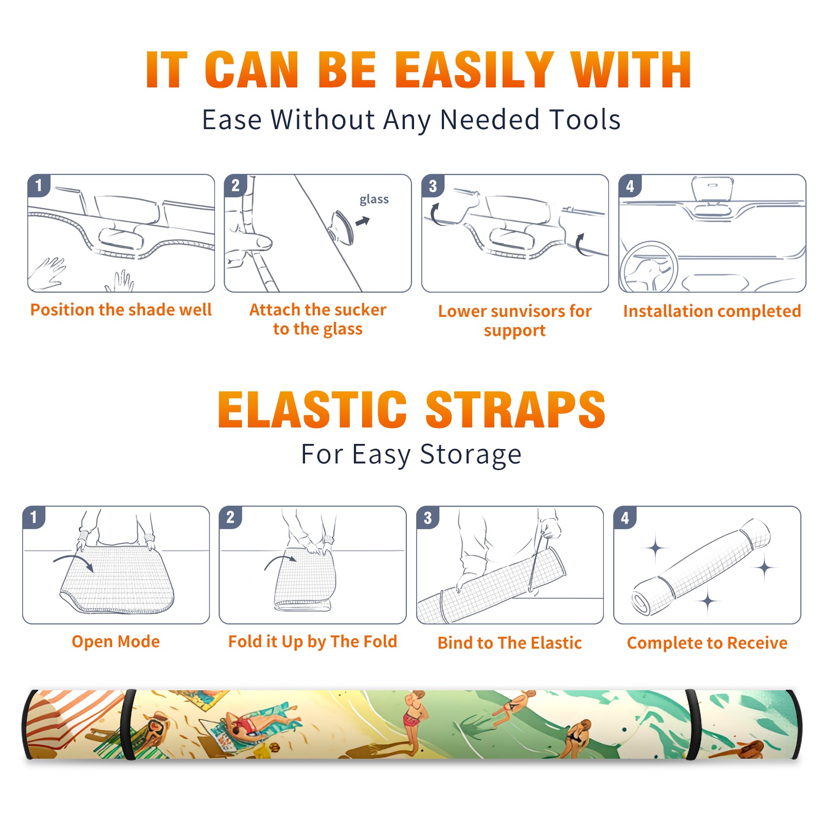 • </b>ZXIVGOQFR Foldable Premium Car Windshield Sunshade is your great solution to reduce your car’s interior temperature dramatically! This is definitely a must-have item for your summer travel! </b> <br> </b>Size: 63"L x 33.5"W </b> <br> </b>Blocking Uv Rays & Heat Insulation</b><br> Our vehicle sunshade provides effective UV, sun, and summer heat protection .Maintains dashboards by preventing fading and cracking <br> </b>Easy-To-Store Folding Design Makes Storage Convenient </b><br> ZXIVGOQFR car sunshades come with removable suction cups and elastic bands that you can install easily and quickly, and the removable suction cups will not leave any marks on your windows when removed. Within seconds, windshield visor can be installed and removed. When not in use,the front windshield can be easily and effectively placed on the door pocket or the dashboard, which is beautiful and does not take up space in the car.<br> <br> </b>PUT UP A 'PROTECTIVE UMBRELLA' FOR YOUR BELOVED CAR!</b>
