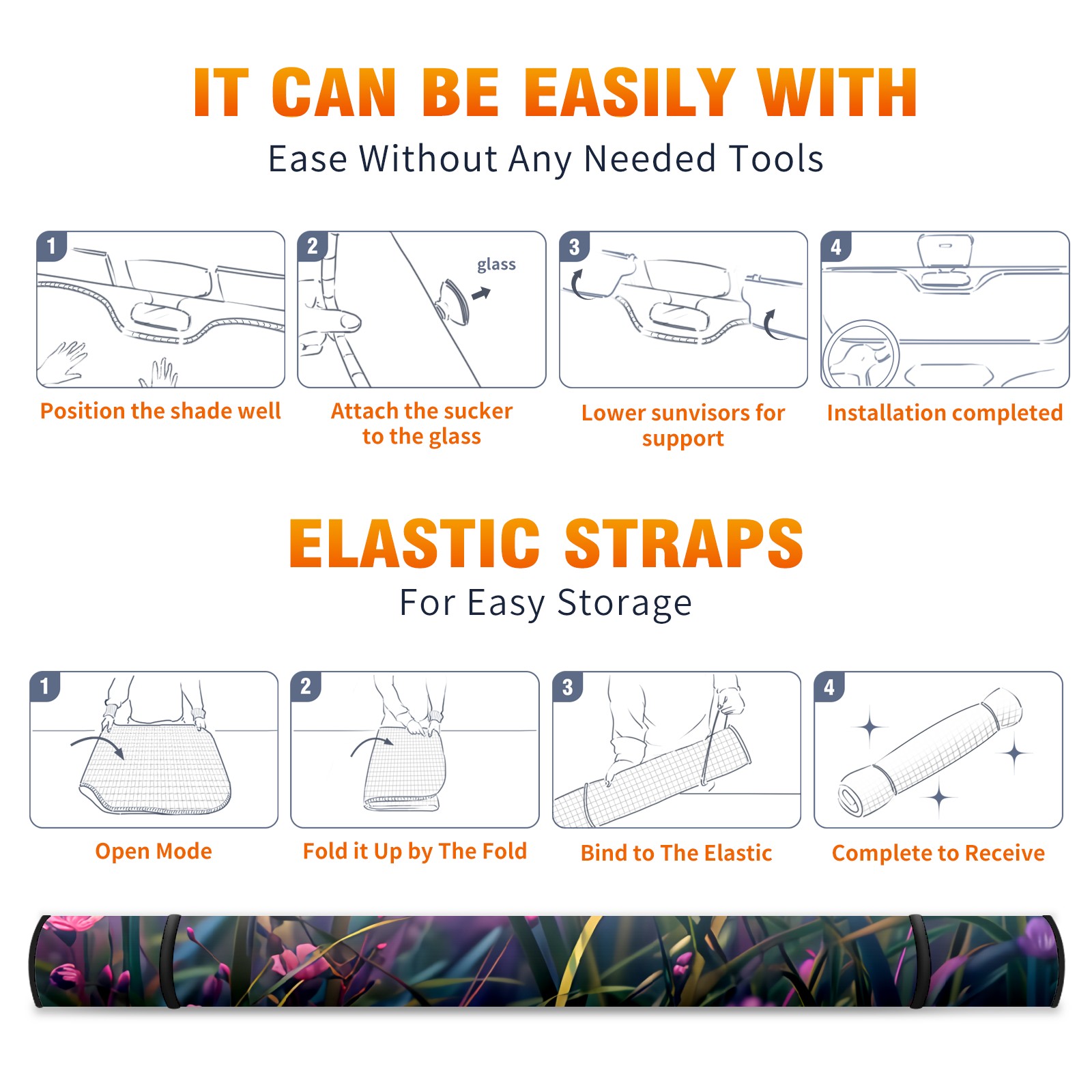• </b>ZXIVGOQFR Foldable Premium Car Windshield Sunshade is your great solution to reduce your car’s interior temperature dramatically! This is definitely a must-have item for your summer travel! </b> <br> </b>Size: 63"L x 33.5"W </b> <br> </b>Blocking Uv Rays & Heat Insulation</b><br> Our vehicle sunshade provides effective UV, sun, and summer heat protection .Maintains dashboards by preventing fading and cracking <br> </b>Easy-To-Store Folding Design Makes Storage Convenient </b><br> ZXIVGOQFR car sunshades come with removable suction cups and elastic bands that you can install easily and quickly, and the removable suction cups will not leave any marks on your windows when removed. Within seconds, windshield visor can be installed and removed. When not in use,the front windshield can be easily and effectively placed on the door pocket or the dashboard, which is beautiful and does not take up space in the car.<br> <br> </b>PUT UP A 'PROTECTIVE UMBRELLA' FOR YOUR BELOVED CAR!</b>