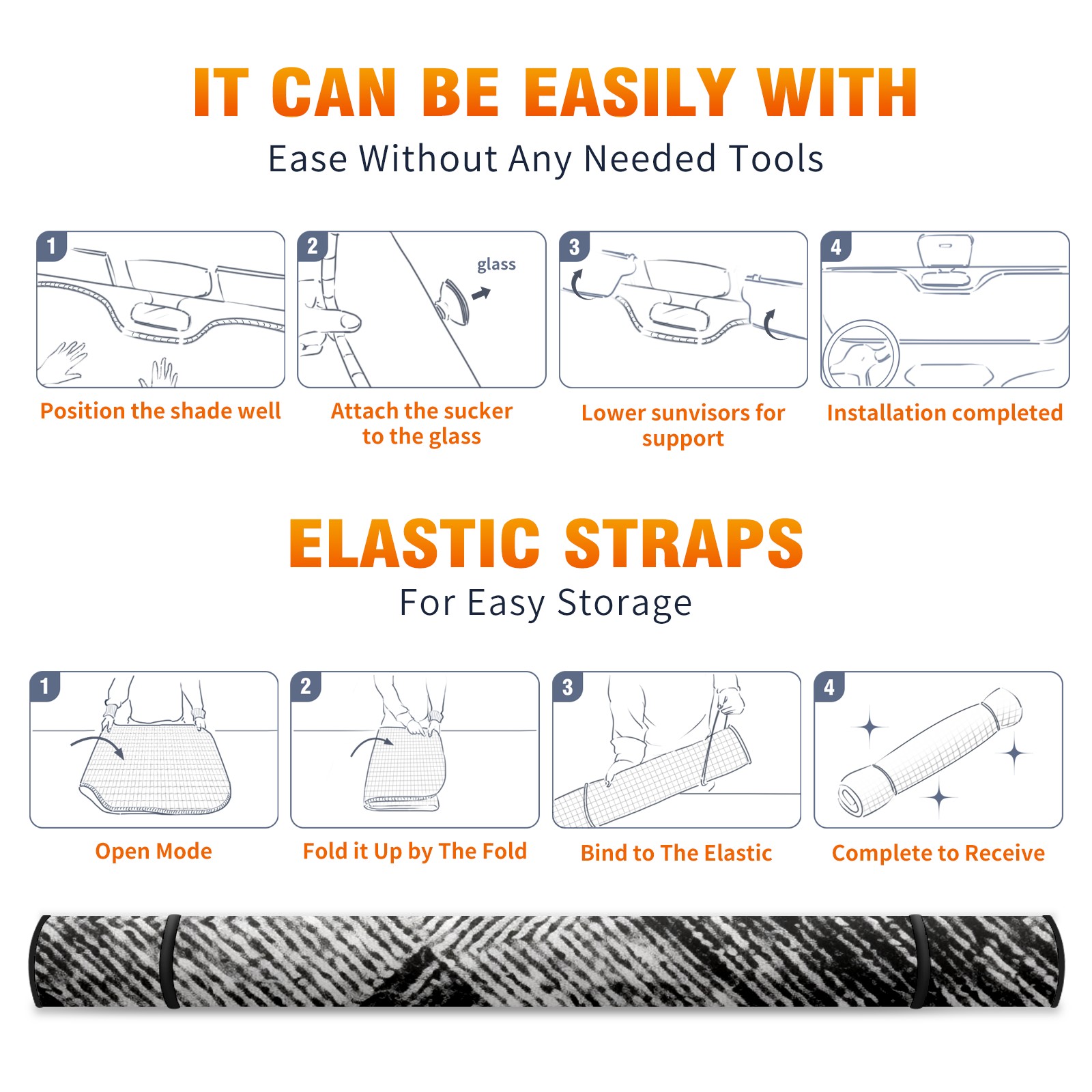 </b>ZXIVGOQFR Foldable Premium Car Windshield Sunshade is your great solution to reduce your car’s interior temperature dramatically! This is definitely a must-have item for your summer travel! </b> <br> </b>Size: 63"L x 33.5"W </b> <br> </b>Blocking Uv Rays & Heat Insulation</b><br> Our vehicle sunshade provides effective UV, sun, and summer heat protection .Maintains dashboards by preventing fading and cracking <br> </b>Easy-To-Store Folding Design Makes Storage Convenient </b><br> ZXIVGOQFR car sunshades come with removable suction cups and elastic bands that you can install easily and quickly, and the removable suction cups will not leave any marks on your windows when removed. Within seconds, windshield visor can be installed and removed. When not in use,the front windshield can be easily and effectively placed on the door pocket or the dashboard, which is beautiful and does not take up space in the car.<br> <br> </b>PUT UP A 'PROTECTIVE UMBRELLA' FOR YOUR BELOVED CAR!</b>