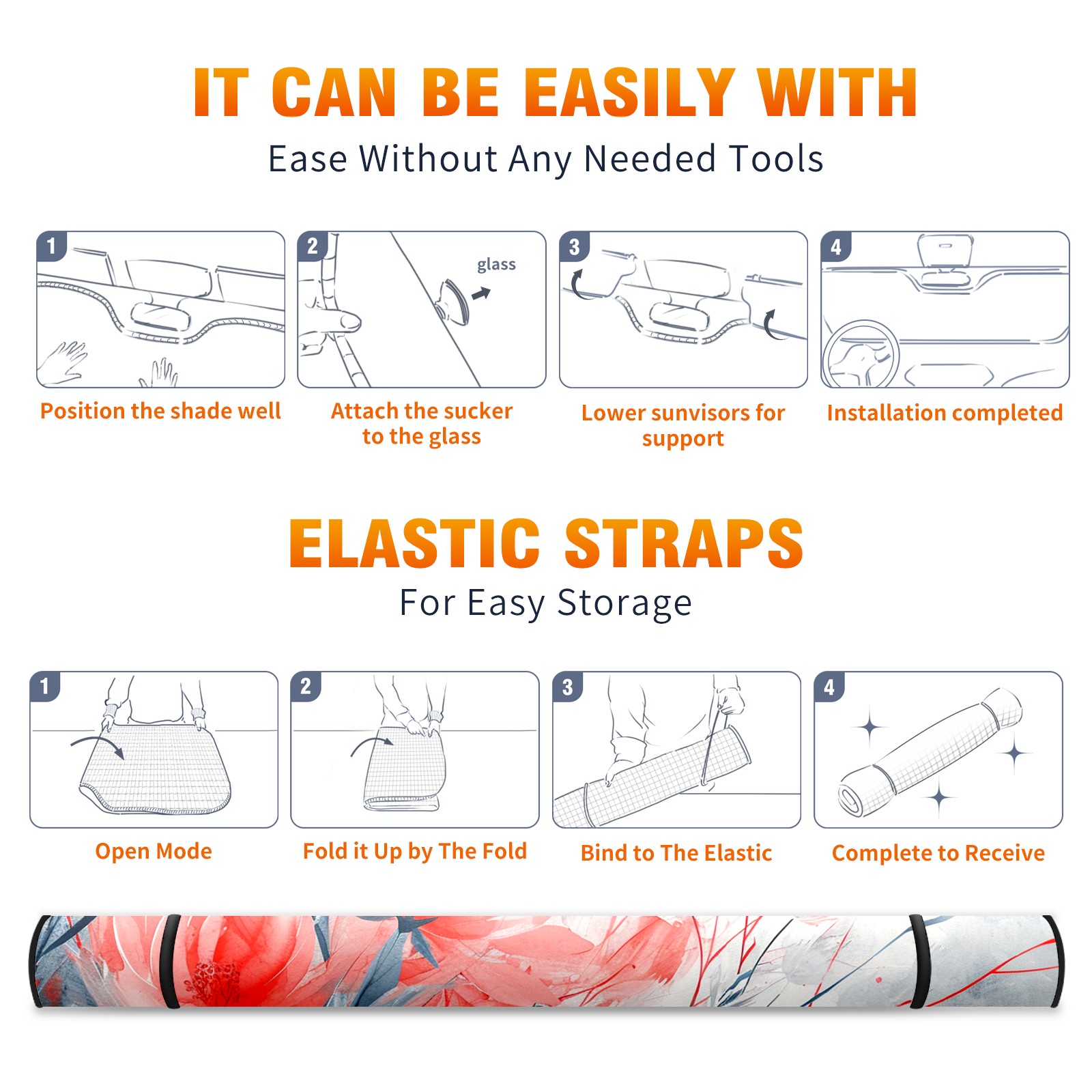 • </b>ZXIVGOQFR Foldable Premium Car Windshield Sunshade is your great solution to reduce your car’s interior temperature dramatically! This is definitely a must-have item for your summer travel! </b> <br> </b>Size: 63"L x 33.5"W </b> <br> </b>Blocking Uv Rays & Heat Insulation</b><br> Our vehicle sunshade provides effective UV, sun, and summer heat protection .Maintains dashboards by preventing fading and cracking <br> </b>Easy-To-Store Folding Design Makes Storage Convenient </b><br> ZXIVGOQFR car sunshades come with removable suction cups and elastic bands that you can install easily and quickly, and the removable suction cups will not leave any marks on your windows when removed. Within seconds, windshield visor can be installed and removed. When not in use,the front windshield can be easily and effectively placed on the door pocket or the dashboard, which is beautiful and does not take up space in the car.<br> <br> </b>PUT UP A 'PROTECTIVE UMBRELLA' FOR YOUR BELOVED CAR!</b>