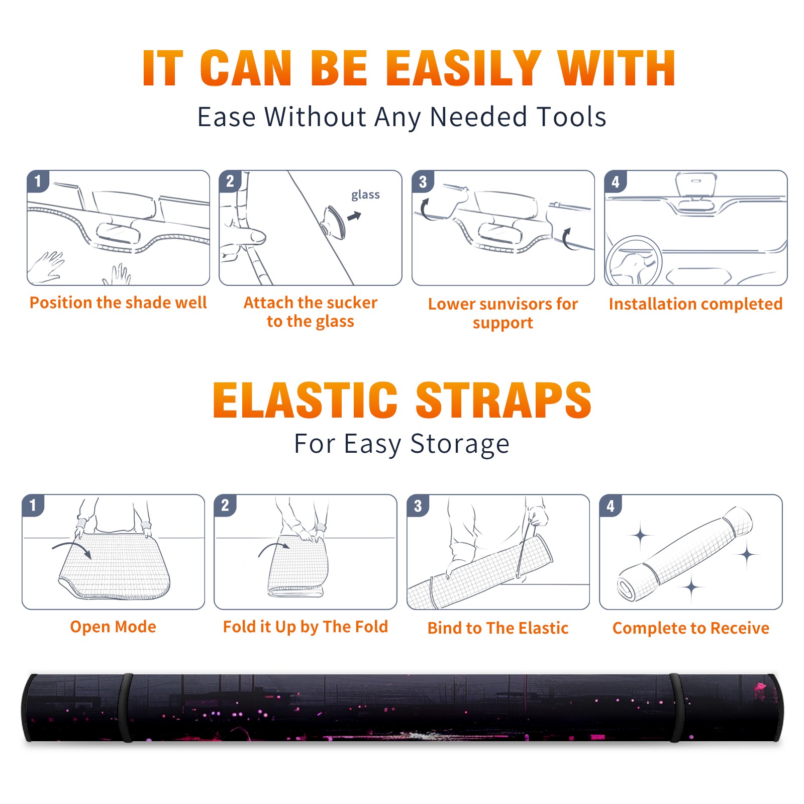 • </b>ZXIVGOQFR Foldable Premium Car Windshield Sunshade is your great solution to reduce your car’s interior temperature dramatically! This is definitely a must-have item for your summer travel! </b> <br> </b>Size: 63"L x 33.5"W </b> <br> </b>Blocking Uv Rays & Heat Insulation</b><br> Our vehicle sunshade provides effective UV, sun, and summer heat protection .Maintains dashboards by preventing fading and cracking <br> </b>Easy-To-Store Folding Design Makes Storage Convenient </b><br> ZXIVGOQFR car sunshades come with removable suction cups and elastic bands that you can install easily and quickly, and the removable suction cups will not leave any marks on your windows when removed. Within seconds, windshield visor can be installed and removed. When not in use,the front windshield can be easily and effectively placed on the door pocket or the dashboard, which is beautiful and does not take up space in the car.<br> <br> </b>PUT UP A 'PROTECTIVE UMBRELLA' FOR YOUR BELOVED CAR!</b>