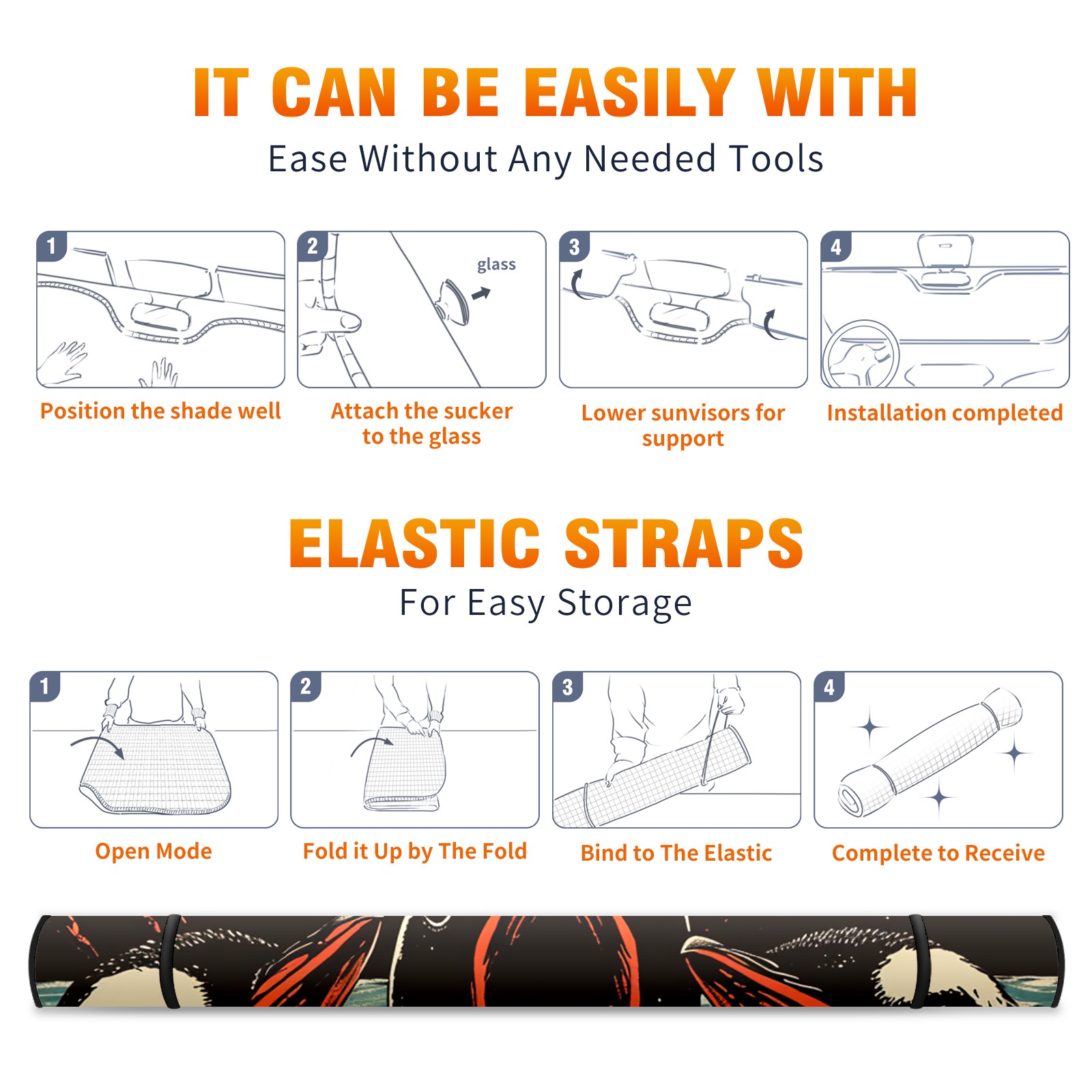 </b>ZXIVGOQFR Foldable Premium Car Windshield Sunshade is your great solution to reduce your car’s interior temperature dramatically! This is definitely a must-have item for your summer travel! </b> <br> </b>Size: 63"L x 33.5"W </b> <br> </b>Blocking Uv Rays & Heat Insulation</b><br> Our vehicle sunshade provides effective UV, sun, and summer heat protection .Maintains dashboards by preventing fading and cracking <br> </b>Easy-To-Store Folding Design Makes Storage Convenient </b><br> ZXIVGOQFR car sunshades come with removable suction cups and elastic bands that you can install easily and quickly, and the removable suction cups will not leave any marks on your windows when removed. Within seconds, windshield visor can be installed and removed. When not in use,the front windshield can be easily and effectively placed on the door pocket or the dashboard, which is beautiful and does not take up space in the car.<br> <br> </b>PUT UP A 'PROTECTIVE UMBRELLA' FOR YOUR BELOVED CAR!</b>