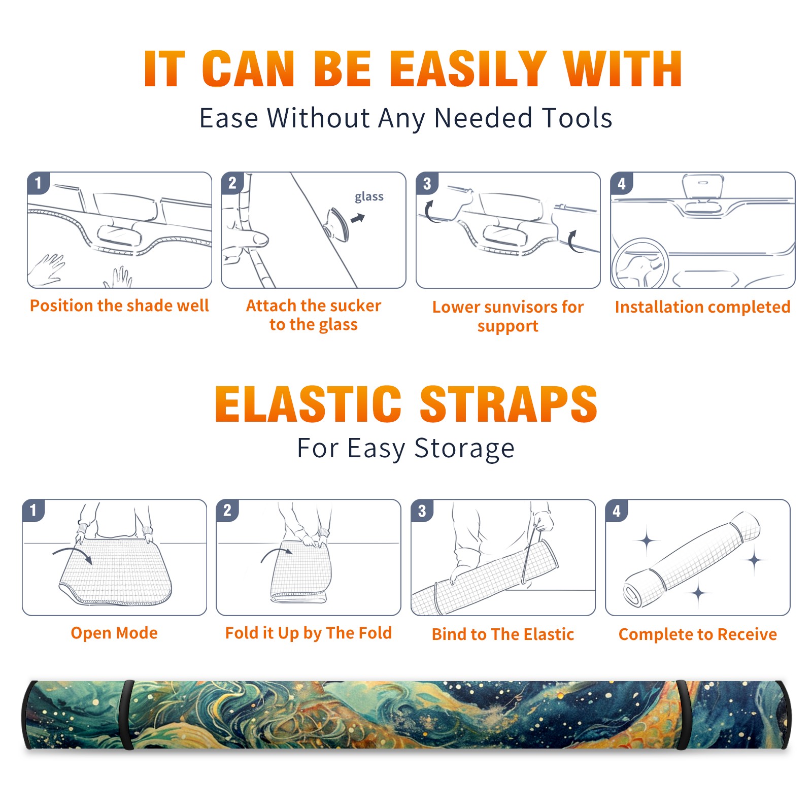 • </b>ZXIVGOQFR Foldable Premium Car Windshield Sunshade is your great solution to reduce your car’s interior temperature dramatically! This is definitely a must-have item for your summer travel! </b> <br> </b>Size: 63"L x 33.5"W </b> <br> </b>Blocking Uv Rays & Heat Insulation</b><br> Our vehicle sunshade provides effective UV, sun, and summer heat protection .Maintains dashboards by preventing fading and cracking <br> </b>Easy-To-Store Folding Design Makes Storage Convenient </b><br> ZXIVGOQFR car sunshades come with removable suction cups and elastic bands that you can install easily and quickly, and the removable suction cups will not leave any marks on your windows when removed. Within seconds, windshield visor can be installed and removed. When not in use,the front windshield can be easily and effectively placed on the door pocket or the dashboard, which is beautiful and does not take up space in the car.<br> <br> </b>PUT UP A 'PROTECTIVE UMBRELLA' FOR YOUR BELOVED CAR!</b>