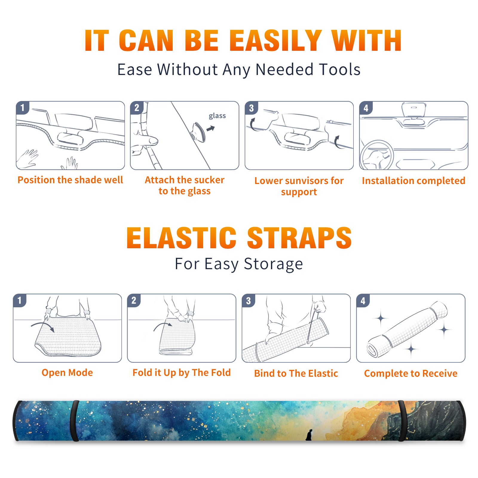 </b>ZXIVGOQFR Foldable Premium Car Windshield Sunshade is your great solution to reduce your car’s interior temperature dramatically! This is definitely a must-have item for your summer travel! </b> <br> </b>Size: 63"L x 33.5"W </b> <br> </b>Blocking Uv Rays & Heat Insulation</b><br> Our vehicle sunshade provides effective UV, sun, and summer heat protection .Maintains dashboards by preventing fading and cracking <br> </b>Easy-To-Store Folding Design Makes Storage Convenient </b><br> ZXIVGOQFR car sunshades come with removable suction cups and elastic bands that you can install easily and quickly, and the removable suction cups will not leave any marks on your windows when removed. Within seconds, windshield visor can be installed and removed. When not in use,the front windshield can be easily and effectively placed on the door pocket or the dashboard, which is beautiful and does not take up space in the car.<br> <br> </b>PUT UP A 'PROTECTIVE UMBRELLA' FOR YOUR BELOVED CAR!</b>