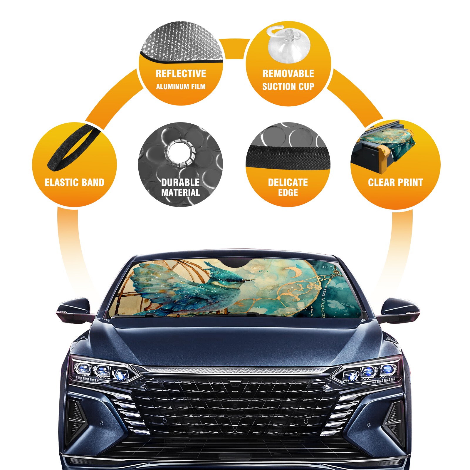 </b>ZXIVGOQFR Foldable Premium Car Windshield Sunshade is your great solution to reduce your car’s interior temperature dramatically! This is definitely a must-have item for your summer travel! </b> <br> </b>Size: 63"L x 33.5"W </b> <br> </b>Blocking Uv Rays & Heat Insulation</b><br> Our vehicle sunshade provides effective UV, sun, and summer heat protection .Maintains dashboards by preventing fading and cracking <br> </b>Easy-To-Store Folding Design Makes Storage Convenient </b><br> ZXIVGOQFR car sunshades come with removable suction cups and elastic bands that you can install easily and quickly, and the removable suction cups will not leave any marks on your windows when removed. Within seconds, windshield visor can be installed and removed. When not in use,the front windshield can be easily and effectively placed on the door pocket or the dashboard, which is beautiful and does not take up space in the car.<br> <br> </b>PUT UP A 'PROTECTIVE UMBRELLA' FOR YOUR BELOVED CAR!</b>