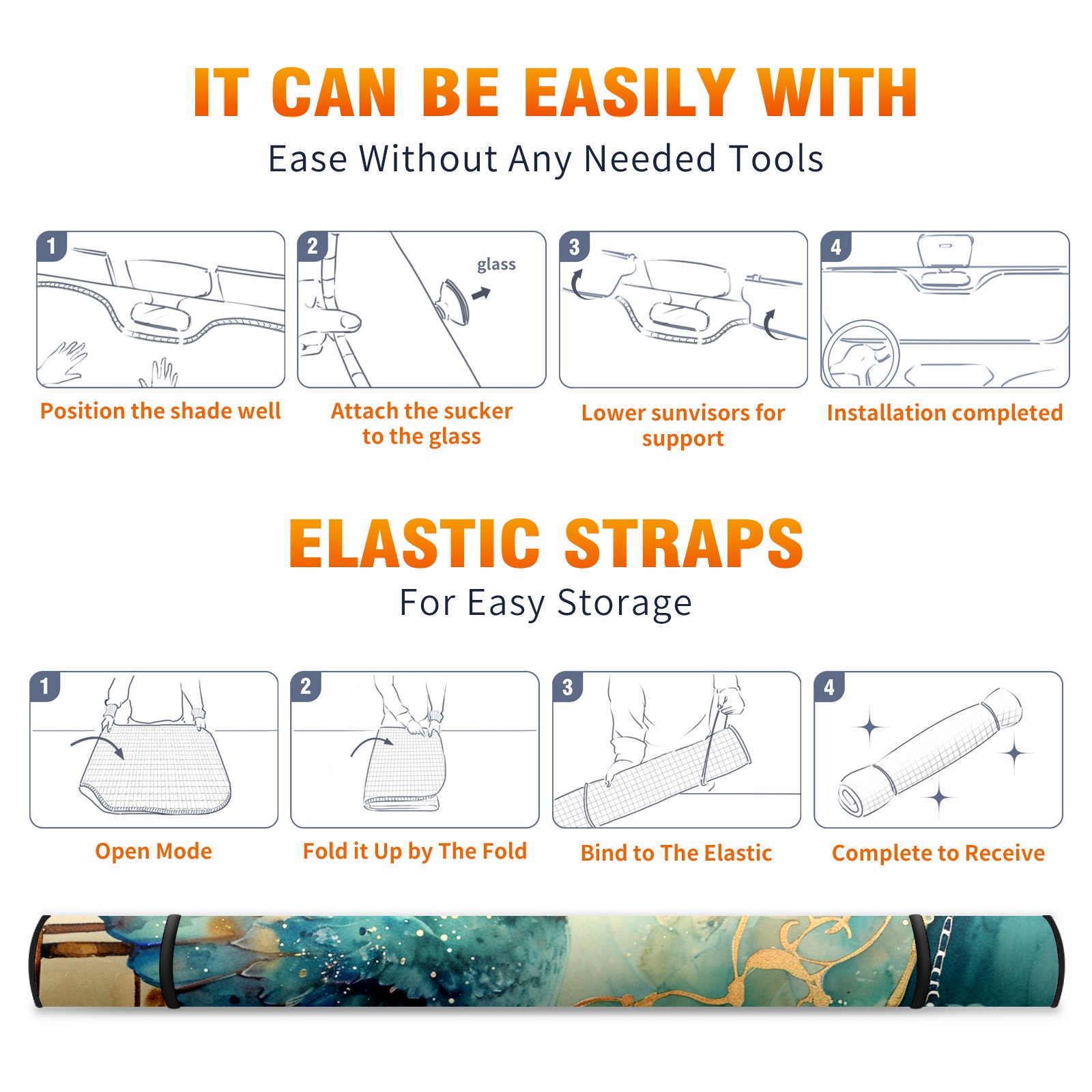 • </b>ZXIVGOQFR Foldable Premium Car Windshield Sunshade is your great solution to reduce your car’s interior temperature dramatically! This is definitely a must-have item for your summer travel! </b> <br> </b>Size: 63"L x 33.5"W </b> <br> </b>Blocking Uv Rays & Heat Insulation</b><br> Our vehicle sunshade provides effective UV, sun, and summer heat protection .Maintains dashboards by preventing fading and cracking <br> </b>Easy-To-Store Folding Design Makes Storage Convenient </b><br> ZXIVGOQFR car sunshades come with removable suction cups and elastic bands that you can install easily and quickly, and the removable suction cups will not leave any marks on your windows when removed. Within seconds, windshield visor can be installed and removed. When not in use,the front windshield can be easily and effectively placed on the door pocket or the dashboard, which is beautiful and does not take up space in the car.<br> <br> </b>PUT UP A 'PROTECTIVE UMBRELLA' FOR YOUR BELOVED CAR!</b>