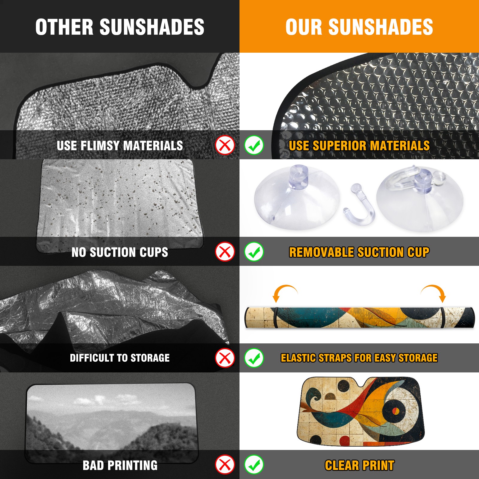 • </b>ZXIVGOQFR Foldable Premium Car Windshield Sunshade is your great solution to reduce your car’s interior temperature dramatically! This is definitely a must-have item for your summer travel! </b> <br> </b>Size: 63"L x 33.5"W </b> <br> </b>Blocking Uv Rays & Heat Insulation</b><br> Our vehicle sunshade provides effective UV, sun, and summer heat protection .Maintains dashboards by preventing fading and cracking <br> </b>Easy-To-Store Folding Design Makes Storage Convenient </b><br> ZXIVGOQFR car sunshades come with removable suction cups and elastic bands that you can install easily and quickly, and the removable suction cups will not leave any marks on your windows when removed. Within seconds, windshield visor can be installed and removed. When not in use,the front windshield can be easily and effectively placed on the door pocket or the dashboard, which is beautiful and does not take up space in the car.<br> <br> </b>PUT UP A 'PROTECTIVE UMBRELLA' FOR YOUR BELOVED CAR!</b>