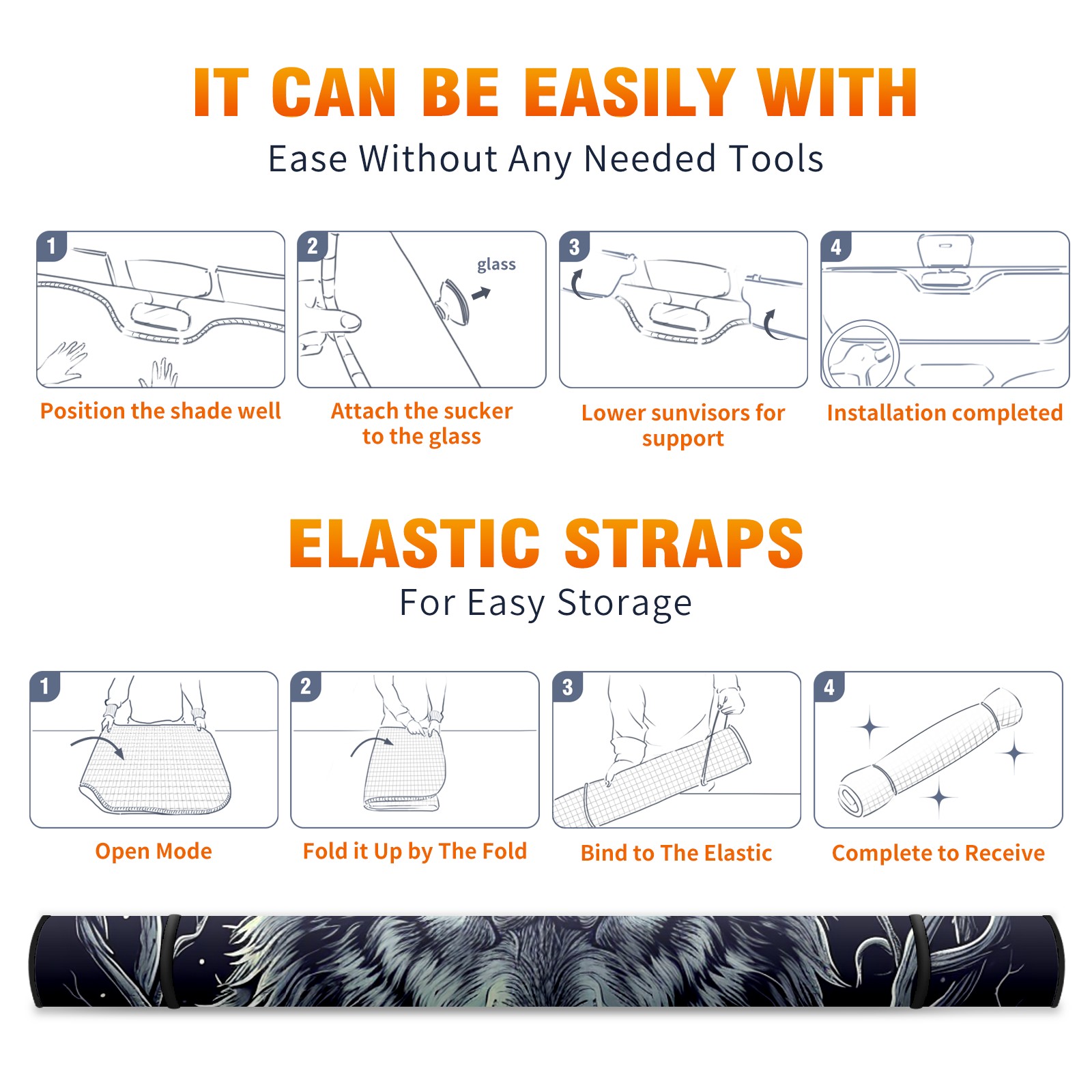 • </b>ZXIVGOQFR Foldable Premium Car Windshield Sunshade is your great solution to reduce your car’s interior temperature dramatically! This is definitely a must-have item for your summer travel! </b> <br> </b>Size: 63"L x 33.5"W </b> <br> </b>Blocking Uv Rays & Heat Insulation</b><br> Our vehicle sunshade provides effective UV, sun, and summer heat protection .Maintains dashboards by preventing fading and cracking <br> </b>Easy-To-Store Folding Design Makes Storage Convenient </b><br> ZXIVGOQFR car sunshades come with removable suction cups and elastic bands that you can install easily and quickly, and the removable suction cups will not leave any marks on your windows when removed. Within seconds, windshield visor can be installed and removed. When not in use,the front windshield can be easily and effectively placed on the door pocket or the dashboard, which is beautiful and does not take up space in the car.<br> <br> </b>PUT UP A 'PROTECTIVE UMBRELLA' FOR YOUR BELOVED CAR!</b>