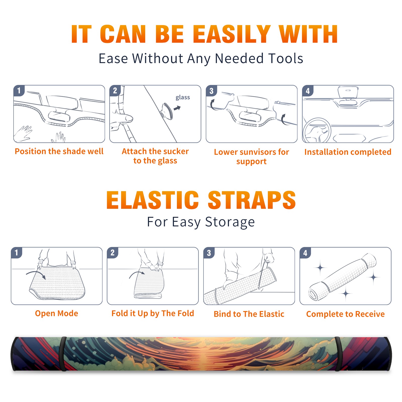 </b>ZXIVGOQFR Foldable Premium Car Windshield Sunshade is your great solution to reduce your car’s interior temperature dramatically! This is definitely a must-have item for your summer travel! </b> <br> </b>Size: 63"L x 33.5"W </b> <br> </b>Blocking Uv Rays & Heat Insulation</b><br> Our vehicle sunshade provides effective UV, sun, and summer heat protection .Maintains dashboards by preventing fading and cracking <br> </b>Easy-To-Store Folding Design Makes Storage Convenient </b><br> ZXIVGOQFR car sunshades come with removable suction cups and elastic bands that you can install easily and quickly, and the removable suction cups will not leave any marks on your windows when removed. Within seconds, windshield visor can be installed and removed. When not in use,the front windshield can be easily and effectively placed on the door pocket or the dashboard, which is beautiful and does not take up space in the car.<br> <br> </b>PUT UP A 'PROTECTIVE UMBRELLA' FOR YOUR BELOVED CAR!</b>
