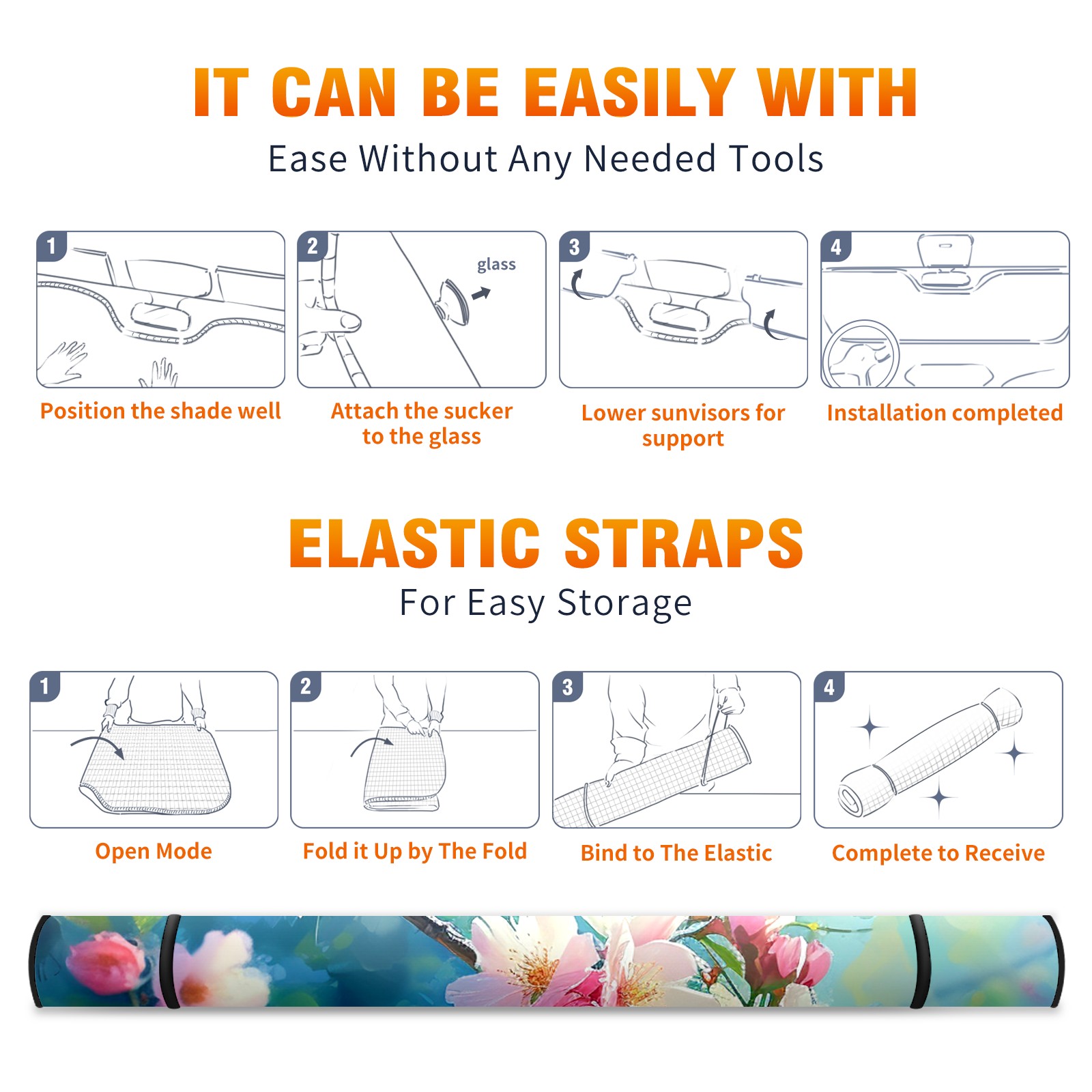 • </b>ZXIVGOQFR Foldable Premium Car Windshield Sunshade is your great solution to reduce your car’s interior temperature dramatically! This is definitely a must-have item for your summer travel! </b> <br> </b>Size: 63"L x 33.5"W </b> <br> </b>Blocking Uv Rays & Heat Insulation</b><br> Our vehicle sunshade provides effective UV, sun, and summer heat protection .Maintains dashboards by preventing fading and cracking <br> </b>Easy-To-Store Folding Design Makes Storage Convenient </b><br> ZXIVGOQFR car sunshades come with removable suction cups and elastic bands that you can install easily and quickly, and the removable suction cups will not leave any marks on your windows when removed. Within seconds, windshield visor can be installed and removed. When not in use,the front windshield can be easily and effectively placed on the door pocket or the dashboard, which is beautiful and does not take up space in the car.<br> <br> </b>PUT UP A 'PROTECTIVE UMBRELLA' FOR YOUR BELOVED CAR!</b>