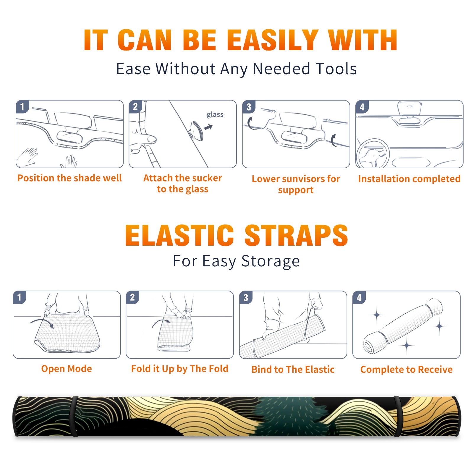 </b>ZXIVGOQFR Foldable Premium Car Windshield Sunshade is your great solution to reduce your car’s interior temperature dramatically! This is definitely a must-have item for your summer travel! </b> <br> </b>Size: 63"L x 33.5"W </b> <br> </b>Blocking Uv Rays & Heat Insulation</b><br> Our vehicle sunshade provides effective UV, sun, and summer heat protection .Maintains dashboards by preventing fading and cracking <br> </b>Easy-To-Store Folding Design Makes Storage Convenient </b><br> ZXIVGOQFR car sunshades come with removable suction cups and elastic bands that you can install easily and quickly, and the removable suction cups will not leave any marks on your windows when removed. Within seconds, windshield visor can be installed and removed. When not in use,the front windshield can be easily and effectively placed on the door pocket or the dashboard, which is beautiful and does not take up space in the car.<br> <br> </b>PUT UP A 'PROTECTIVE UMBRELLA' FOR YOUR BELOVED CAR!</b>