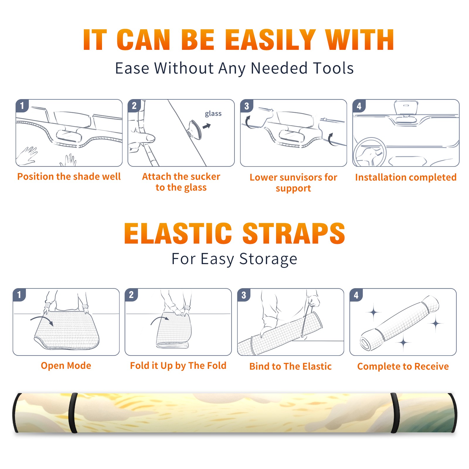 • </b>ZXIVGOQFR Foldable Premium Car Windshield Sunshade is your great solution to reduce your car’s interior temperature dramatically! This is definitely a must-have item for your summer travel! </b> <br> </b>Size: 63"L x 33.5"W </b> <br> </b>Blocking Uv Rays & Heat Insulation</b><br> Our vehicle sunshade provides effective UV, sun, and summer heat protection .Maintains dashboards by preventing fading and cracking <br> </b>Easy-To-Store Folding Design Makes Storage Convenient </b><br> ZXIVGOQFR car sunshades come with removable suction cups and elastic bands that you can install easily and quickly, and the removable suction cups will not leave any marks on your windows when removed. Within seconds, windshield visor can be installed and removed. When not in use,the front windshield can be easily and effectively placed on the door pocket or the dashboard, which is beautiful and does not take up space in the car.<br> <br> </b>PUT UP A 'PROTECTIVE UMBRELLA' FOR YOUR BELOVED CAR!</b>