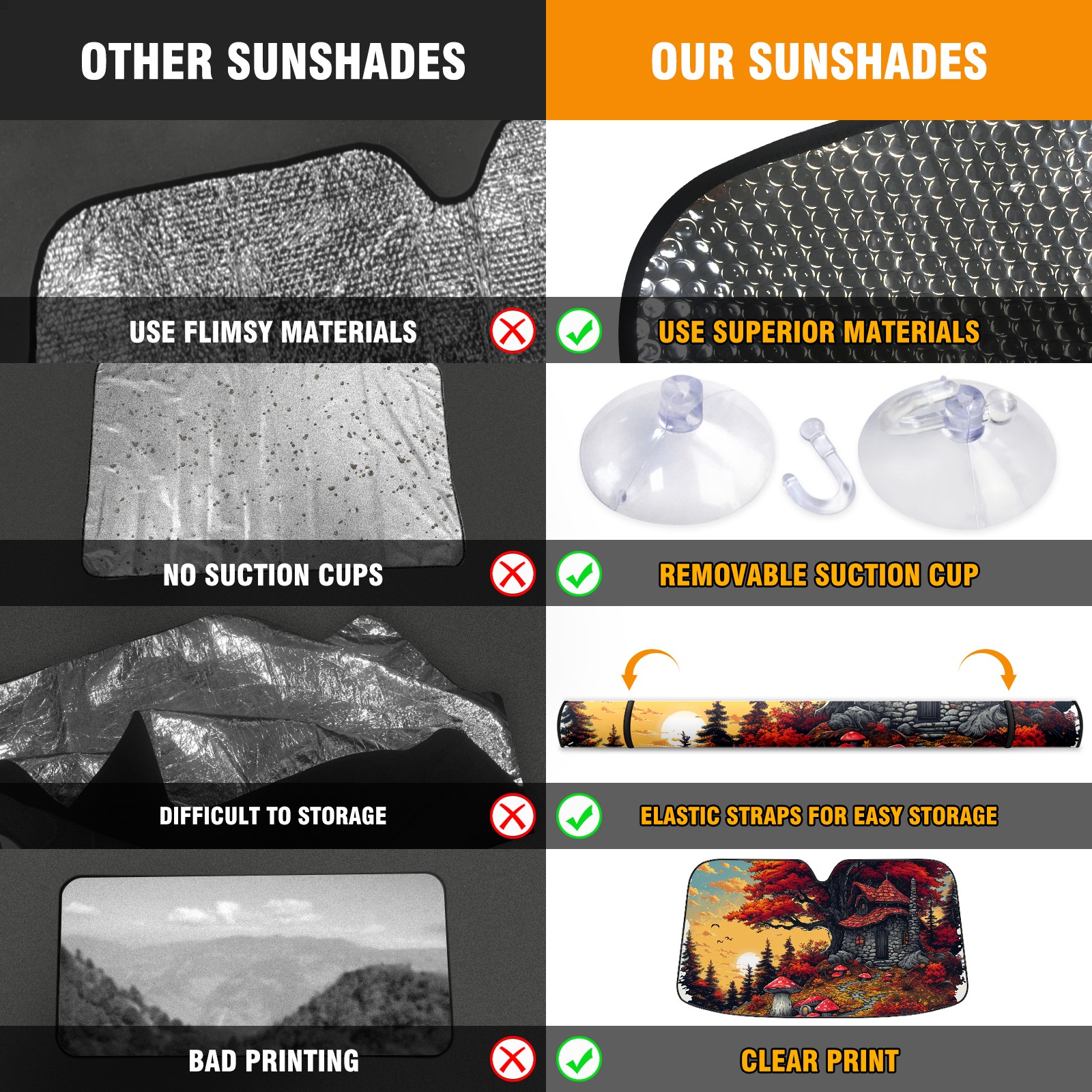 • </b>ZXIVGOQFR Foldable Premium Car Windshield Sunshade is your great solution to reduce your car’s interior temperature dramatically! This is definitely a must-have item for your summer travel! </b> <br> </b>Size: 63"L x 33.5"W </b> <br> </b>Blocking Uv Rays & Heat Insulation</b><br> Our vehicle sunshade provides effective UV, sun, and summer heat protection .Maintains dashboards by preventing fading and cracking <br> </b>Easy-To-Store Folding Design Makes Storage Convenient </b><br> ZXIVGOQFR car sunshades come with removable suction cups and elastic bands that you can install easily and quickly, and the removable suction cups will not leave any marks on your windows when removed. Within seconds, windshield visor can be installed and removed. When not in use,the front windshield can be easily and effectively placed on the door pocket or the dashboard, which is beautiful and does not take up space in the car.<br> <br> </b>PUT UP A 'PROTECTIVE UMBRELLA' FOR YOUR BELOVED CAR!</b>