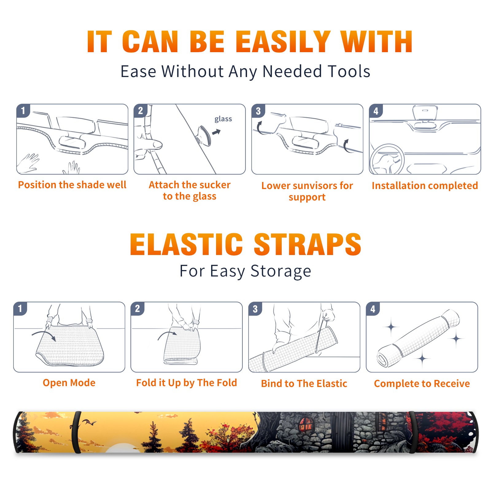 </b>ZXIVGOQFR Foldable Premium Car Windshield Sunshade is your great solution to reduce your car’s interior temperature dramatically! This is definitely a must-have item for your summer travel! </b> <br> </b>Size: 63"L x 33.5"W </b> <br> </b>Blocking Uv Rays & Heat Insulation</b><br> Our vehicle sunshade provides effective UV, sun, and summer heat protection .Maintains dashboards by preventing fading and cracking <br> </b>Easy-To-Store Folding Design Makes Storage Convenient </b><br> ZXIVGOQFR car sunshades come with removable suction cups and elastic bands that you can install easily and quickly, and the removable suction cups will not leave any marks on your windows when removed. Within seconds, windshield visor can be installed and removed. When not in use,the front windshield can be easily and effectively placed on the door pocket or the dashboard, which is beautiful and does not take up space in the car.<br> <br> </b>PUT UP A 'PROTECTIVE UMBRELLA' FOR YOUR BELOVED CAR!</b>