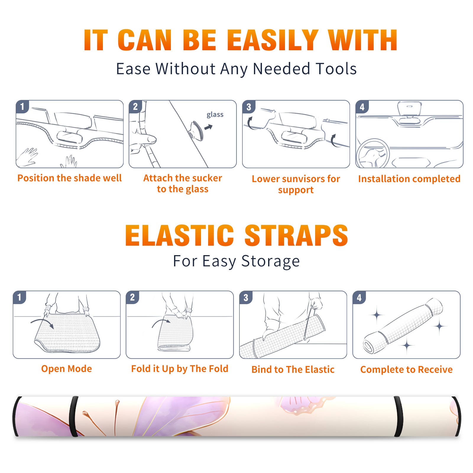 • </b>ZXIVGOQFR Foldable Premium Car Windshield Sunshade is your great solution to reduce your car’s interior temperature dramatically! This is definitely a must-have item for your summer travel! </b> <br> </b>Size: 63"L x 33.5"W </b> <br> </b>Blocking Uv Rays & Heat Insulation</b><br> Our vehicle sunshade provides effective UV, sun, and summer heat protection .Maintains dashboards by preventing fading and cracking <br> </b>Easy-To-Store Folding Design Makes Storage Convenient </b><br> ZXIVGOQFR car sunshades come with removable suction cups and elastic bands that you can install easily and quickly, and the removable suction cups will not leave any marks on your windows when removed. Within seconds, windshield visor can be installed and removed. When not in use,the front windshield can be easily and effectively placed on the door pocket or the dashboard, which is beautiful and does not take up space in the car.<br> <br> </b>PUT UP A 'PROTECTIVE UMBRELLA' FOR YOUR BELOVED CAR!</b>
